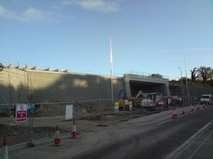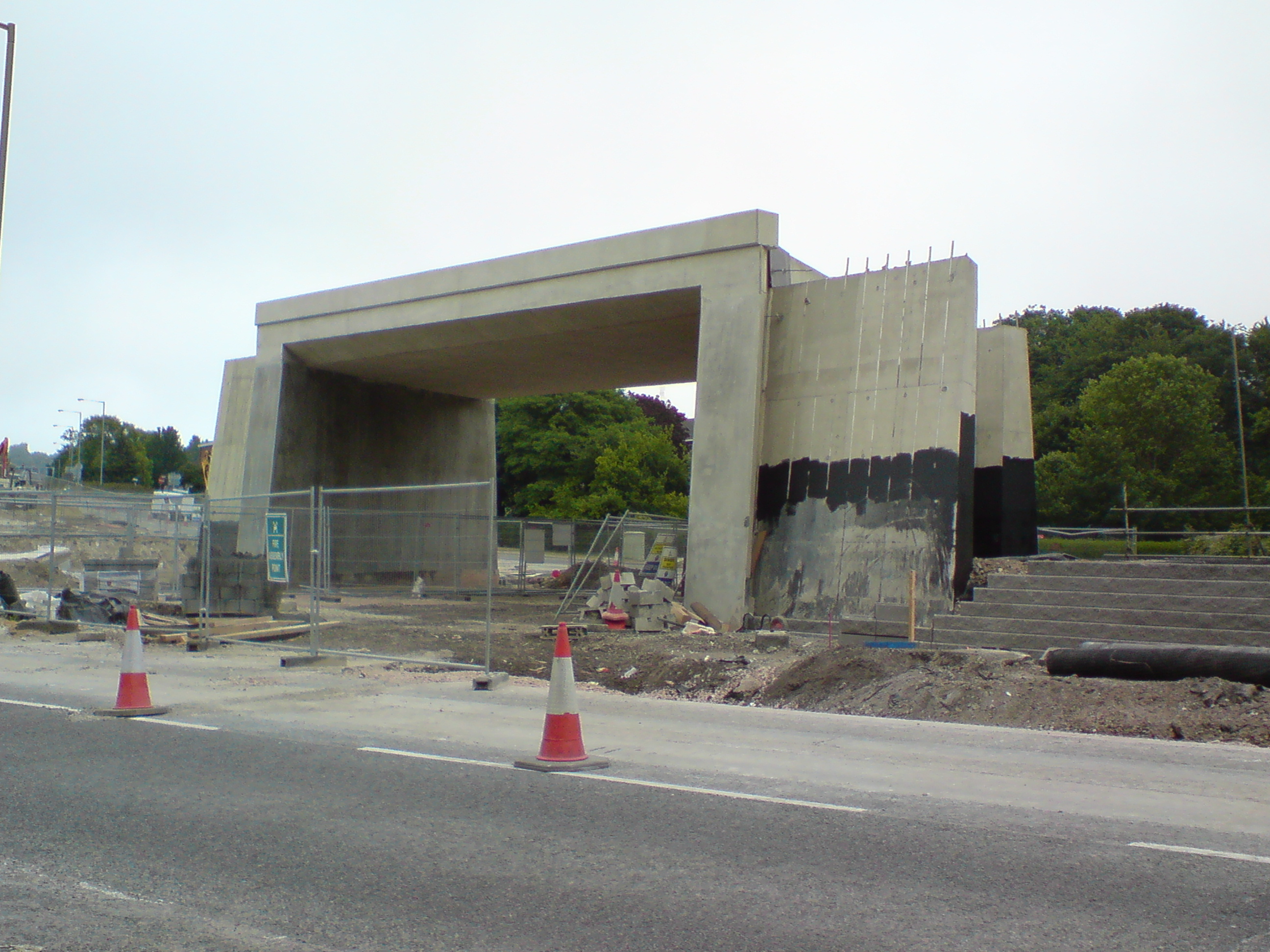 An update on the flyover. The aggregate has been arriving by the truckload and a wall has been erected on either side.