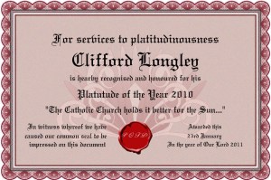 We have waited some time for the winner to be announced of the Platitude of the Day annual award – the Web’s antidote to the nonsense that is Thought for the Day on Radio 4. Those of us who are regular contributors to the Platitude blog agreed with the Adminstrator that it should be Clifford Longley for his consistency over the preceding year. The Adminstrator last week offered a list of nominees which included Ratzinger’s effort on 24 December (despite it not being particularly platitudinous). However, Ratzinger has offered plenty of platitudes over the previous year. Not enough, it was Longley. Incidentally, the quality of contributions so far this year has been poor relative to the last quarter of 2010.