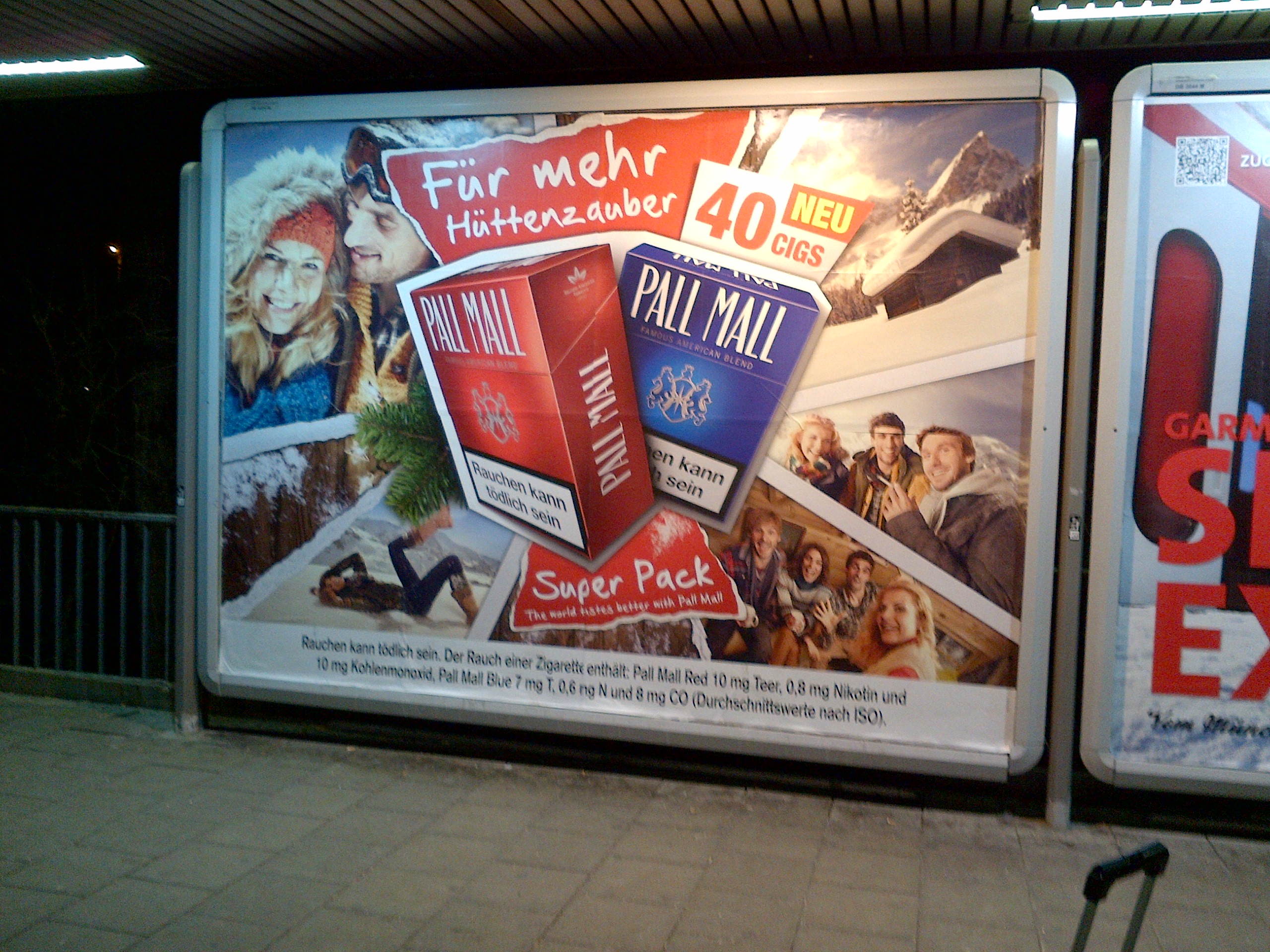 With that in mind, I still find it very strange that the Germans still allow cigarette advertising. This one for Pall Mall can be found on all railway stations in Munich and maybe elsewhere. It depicts a group of beautiful young people in the Alps (presumably skiing) killing themselves with cigarettes.