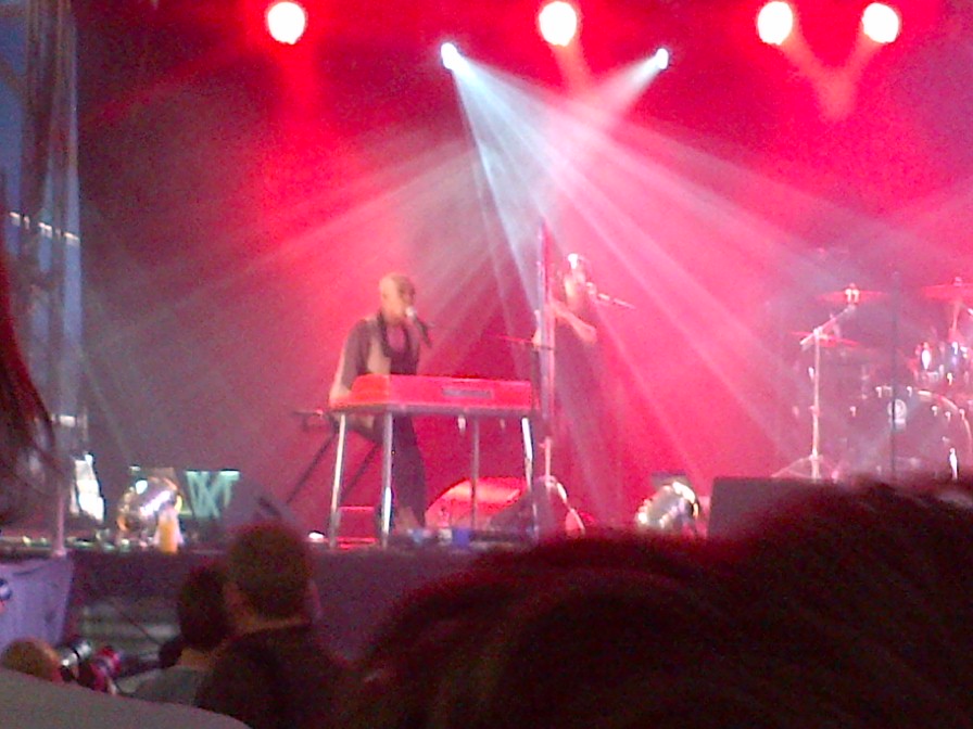 The other band that we saw with a Kraftwerk debt are Austra (left). Appearing on the BBC 6 Music Stage, they performed tracks from their new album, Olympia. This album is disappointing relative to their debut, ‘Feel it Break’. But played live, one can jettison the bemusing melancholy of the lyrics that weigh down the album, and enjoy the extraordinariness of lead singer, Kate Selmanis’ voice.