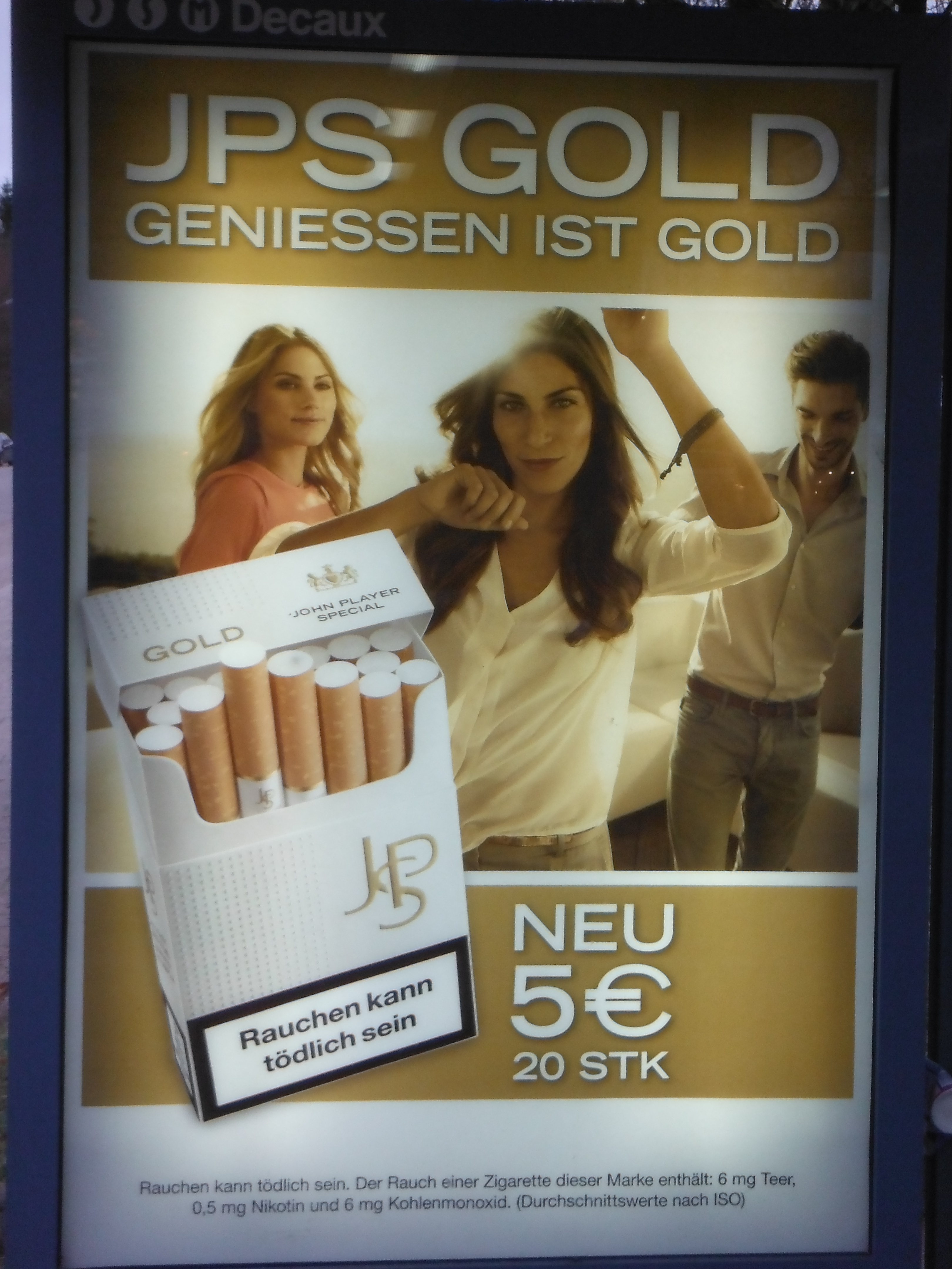 There’s been a lull over the summer regarding cigarette advertising in Germany. Arriving in Munich last night I spotted a couple of new campaigns: Vogue and John Player.
