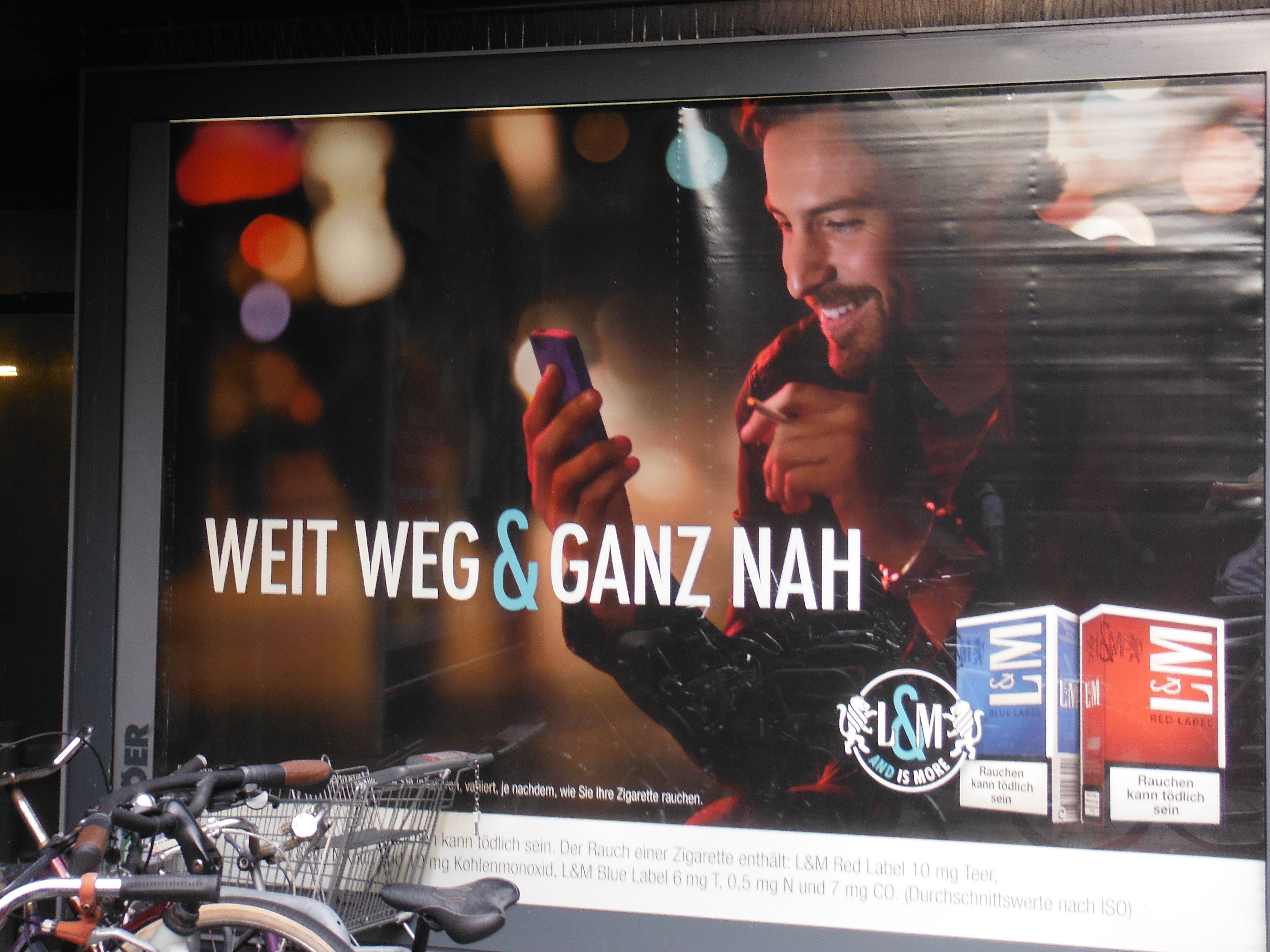 L&M has waded into the advertising space that is Germany. And the approach is the opposite of Lucky Strike. Lucky Strike has been dispensing with technology in favour of books and unmediated human interaction (see post 29 June, 2014). L&M celebrates technology. Bloke on his mobile, big smile, lit cigarette. The strap line, “far away and very close”. Hence the technology. He’s probably checking that his health insurance covers extreme sports such as smoking.
