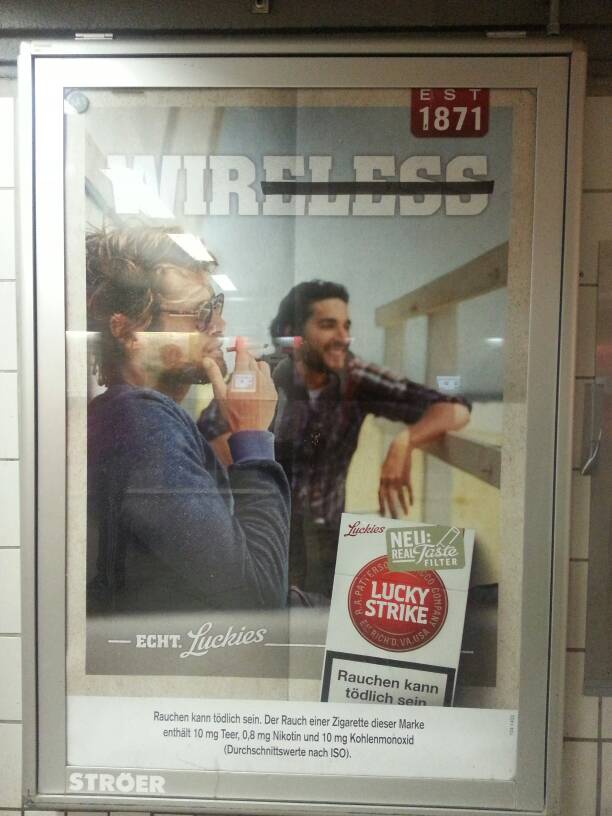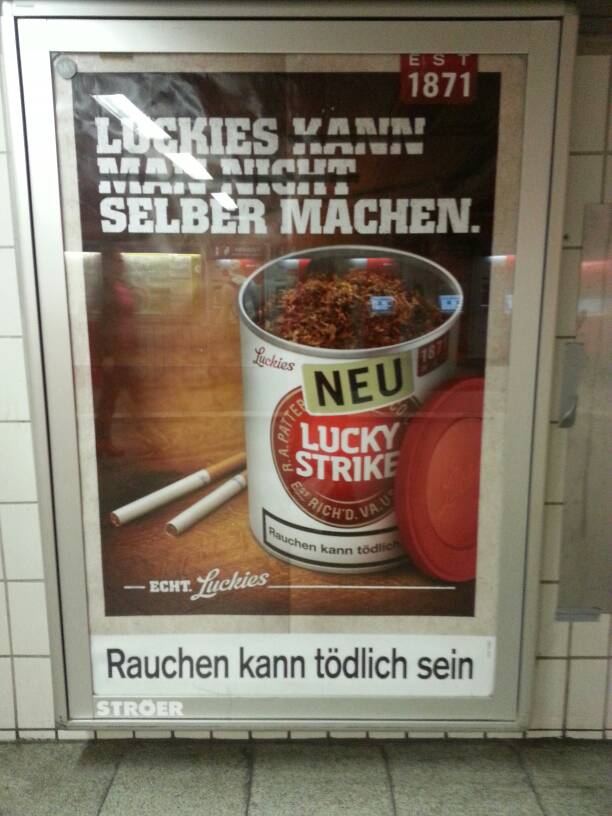 But to add a certain confusion, here is the latest. “Luckies kann man nicht selber machen” [one cannot make Luckies by oneself]. When applying the strike-through magic, it becomes “Luckies selber machen” [make your own Luckies]. At first, it looked like a tin of tobacco soup. I realised that was stupid. Actually, it is Lucky Strike going into roll-ups. In a tin. Collectable and beautifully engineered, but let us see how a Lucky Strike roll-up goes down. Watch this space.