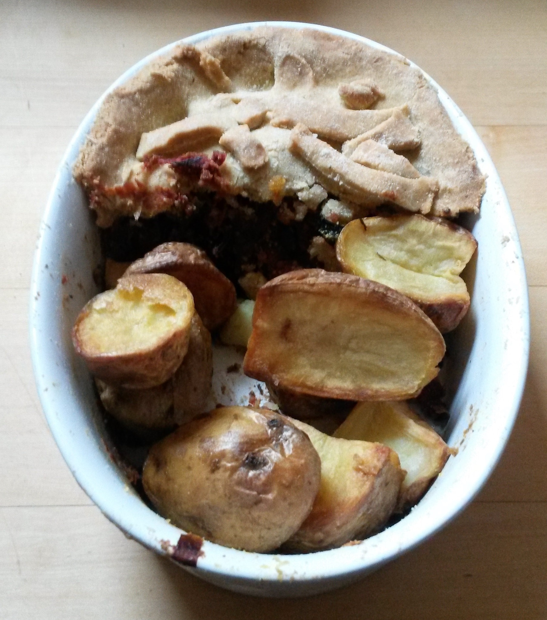 Actually, it became a bit of a pie (I used the same pastry that I had used for the starter and I was unable to roll it, not least because Tom Hunt’s recipe uses pasta and not pastry). Mine, therefore, is more of a root pie – grated beetroot, carrot with onions, leek, fennel, dark brassica leaves, chestnuts, figs, red wine and flavoured with fresh mint and black pepper. It was started in a wok before being transferred to a dish and baked for 30 mins at about 150 degrees celsius.