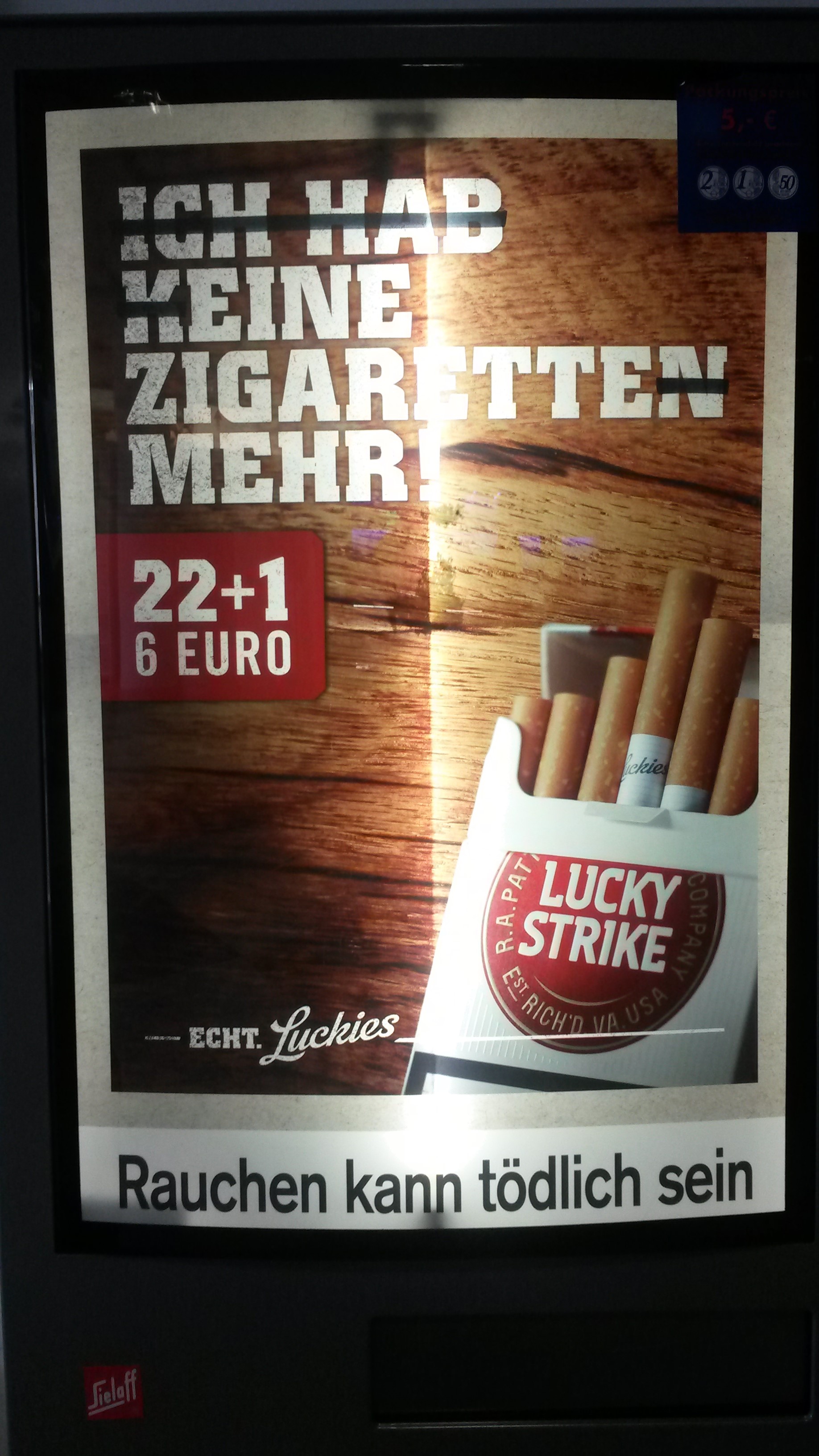 The cigarette machines offer additional opportunities for state-of-the-art advertising (right). “Ich hab meine Zigaretten mehr” translates as I have more cigarettes, becomes one cigarette more (customers get one extra free, seemingly). What an amazing brand!