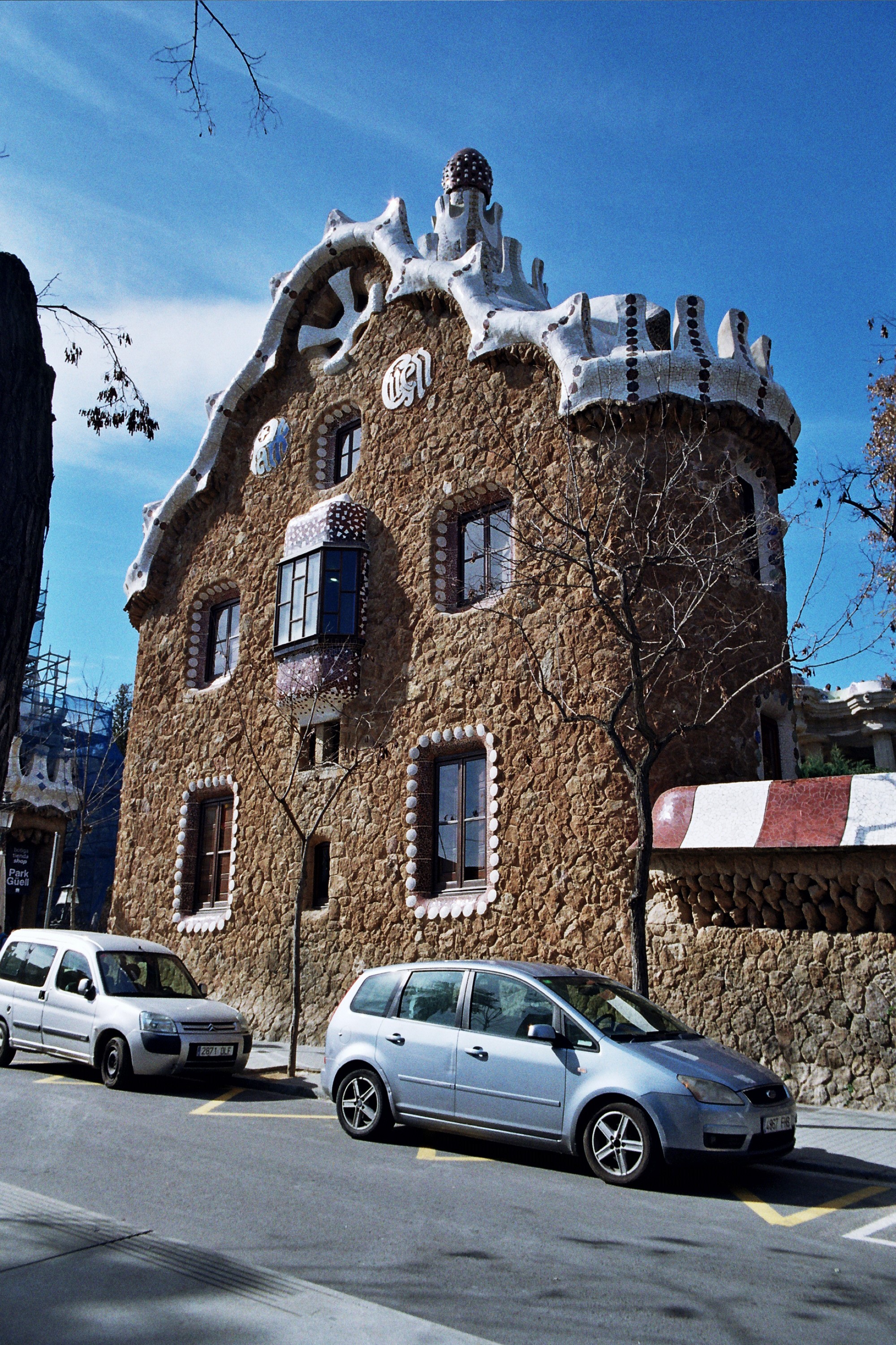 rk Güill is in the north-west of Barcelona and can be reached using the Metro Line L3 (direction, Canyelles) alighting at Vallcarca. The route to the park is well signposted for pedestrians who are treated to a most unusual set of outdoor escalators to aid mobility to the elevated Park. The main entrance is flanked by a visitors pavilion with a mushroom chimney and a tower with a cross pointing in 6 directions. In essence, the entrance is one great puzzle full of references to the architect’s childhood (elephants in Montserrat, apparently) and piety. One could easily spend the day interpreting the