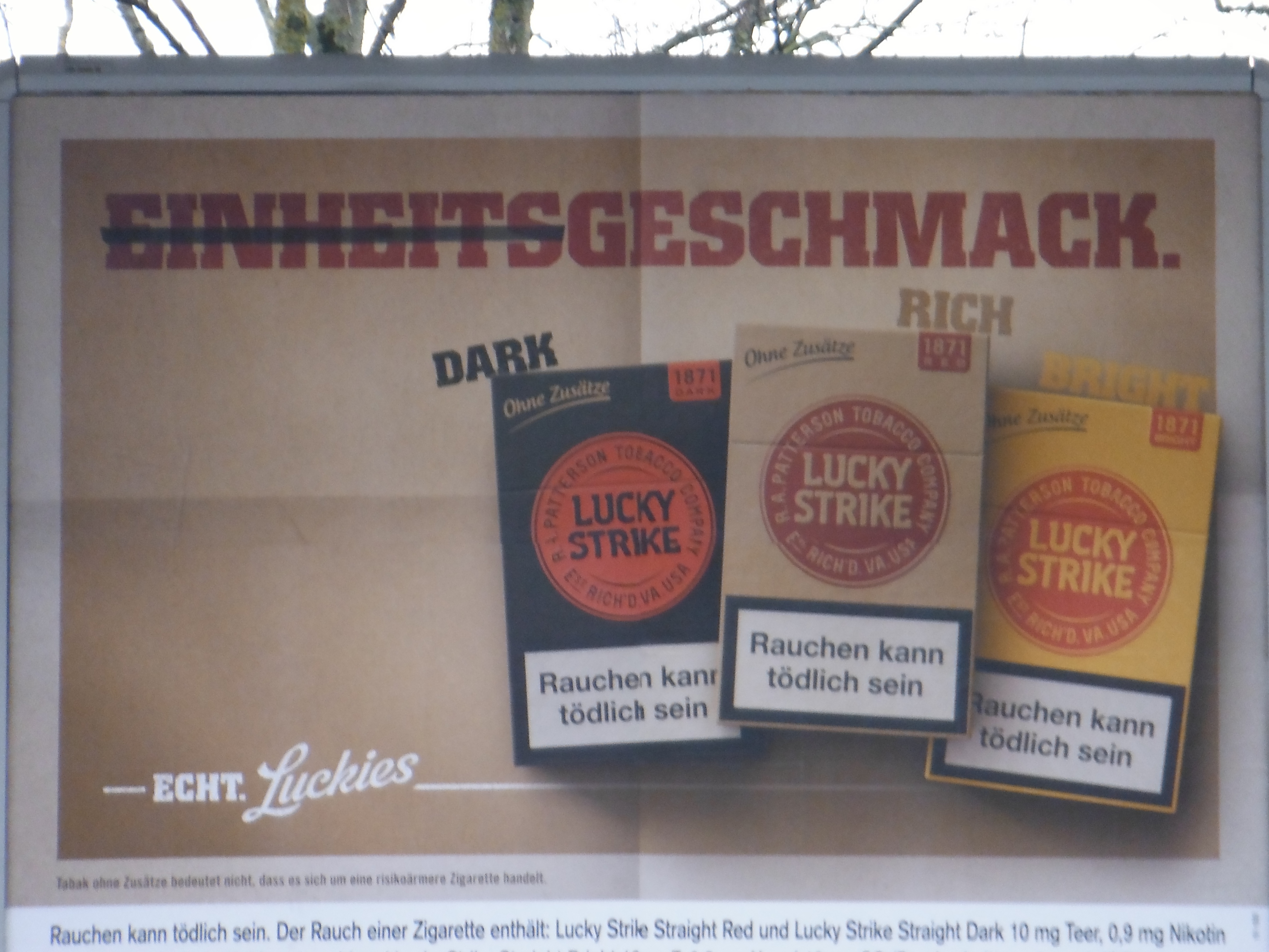 Back on the streets of Munich roars Lucky Strike with its strike-through cod cleverness. The pointless statement (left) “Einheitsgeschmack” translated as uniform taste (there are three varieties to choose from) is shortened to “Geschmack”, merely taste.