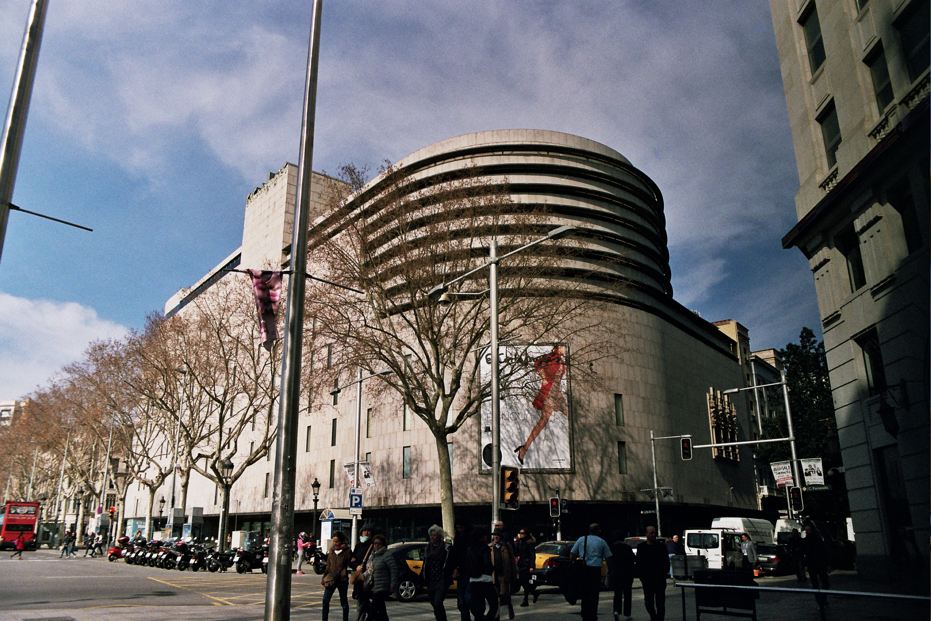 Plaça Catalunya at the top of La Rambla where the El Corte Inglés department store flirts in its alluring modernist building (left). There are numerous secluded squares on which to sit, some more peaceful than others, all have access to coffee. As a rule.