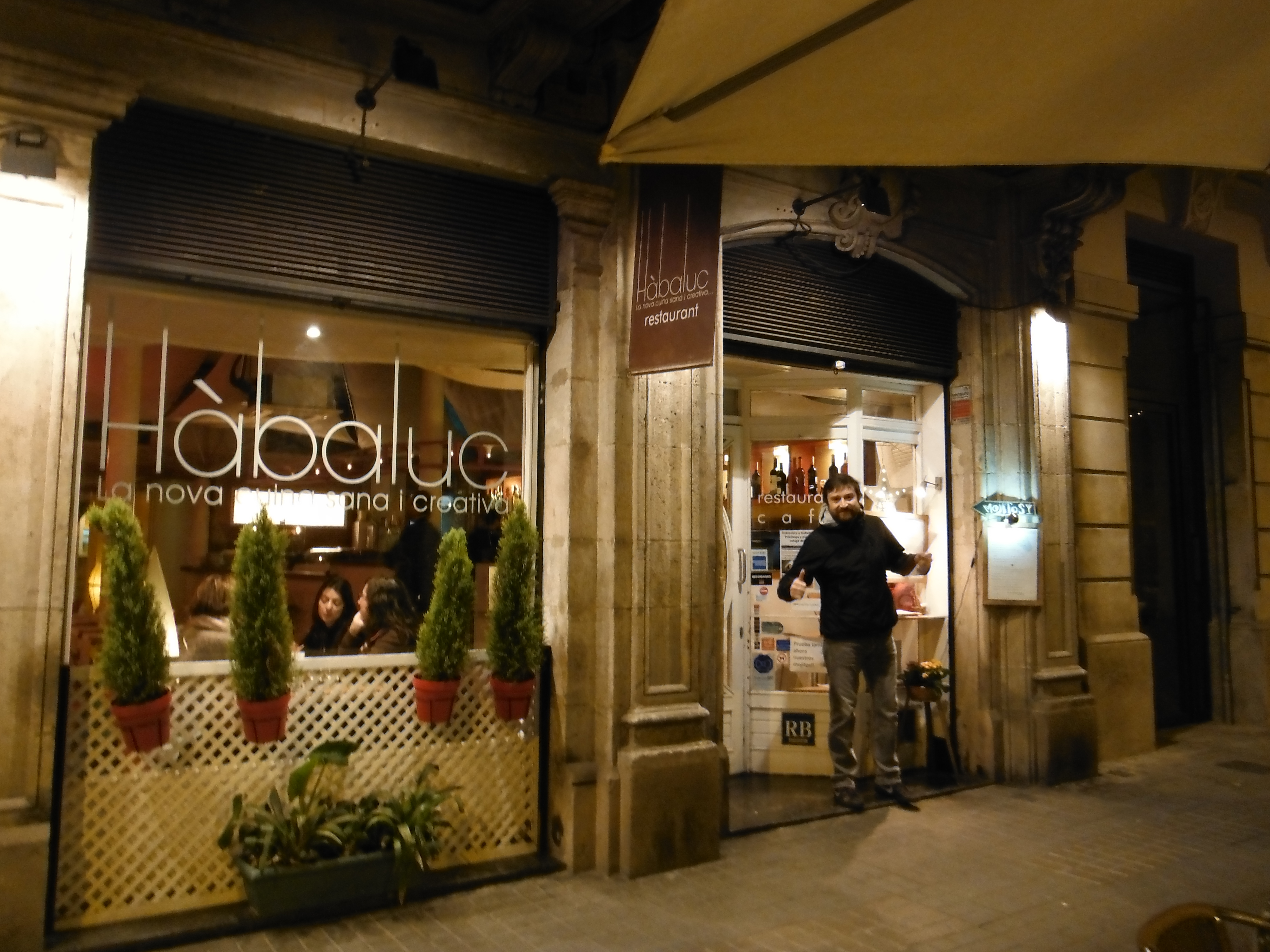ate three times in a restaurant called Hàbaluc (http://restaurantehabaluc.com/). It is cheap, cheerful, has a menu in English and a good selection of intelligent vegetarian main courses allowing us to visit three times without eating the same option more than once. They sell wine by the glass and their desserts are crafted almost to pudding perfection.