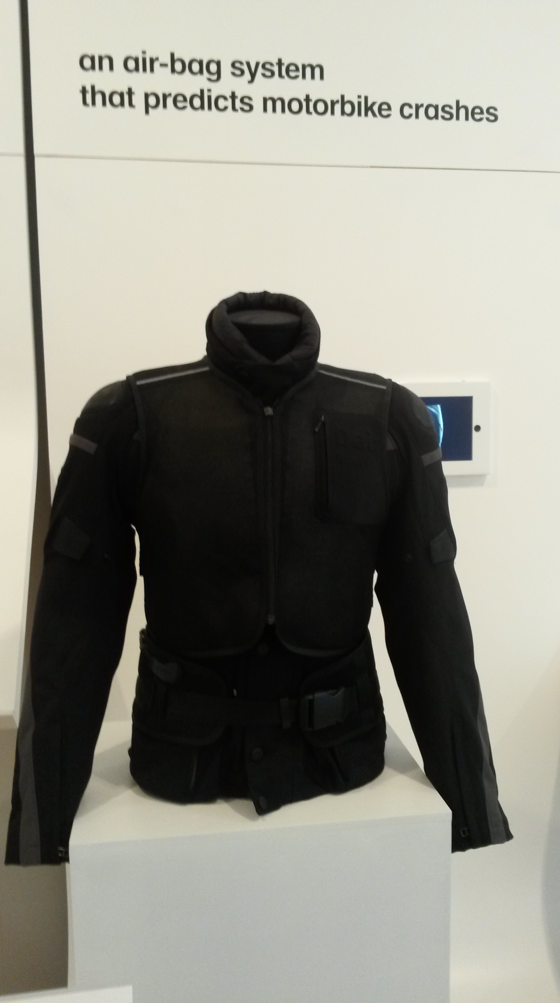 It is a jacket that anticipates a body-damaging accident or fall from a motorbike. There are sensors in the front fork (to detect a collision) and on the side (in anticipation of a non-collision-caused fall). A wireless signal is sent to the jacket which then inflates and protects the vital organs and bones. The designer is Vittorio Cafaggi.