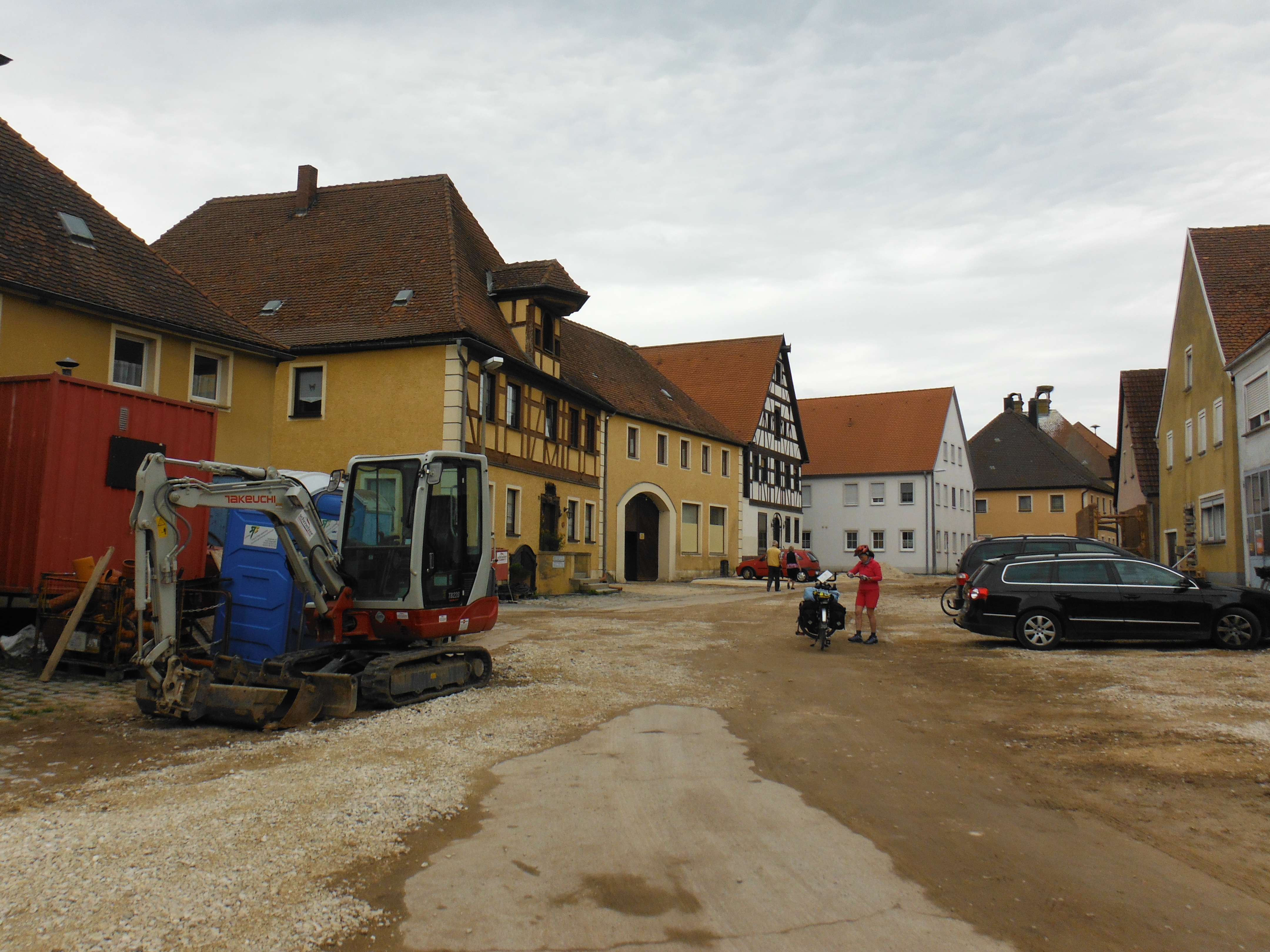 We found ourselves in Gasthof zur Krone having coffee and Apfel Strudel in Leutershausen (the Gasthof kitchens in Bavaria are mostly closed between 1500 and 1800, there is little hot food to get). The landlord told us that rain was forecast for around 6pm and if we wanted to make it to Rothenburg before it came (we were keen to get the tent up before it set in) then we should take a short cut. The road that was recommended seemed rather substantial (st2249). But in the event, largely unused. A recommended detour. A bit more hilly, though.