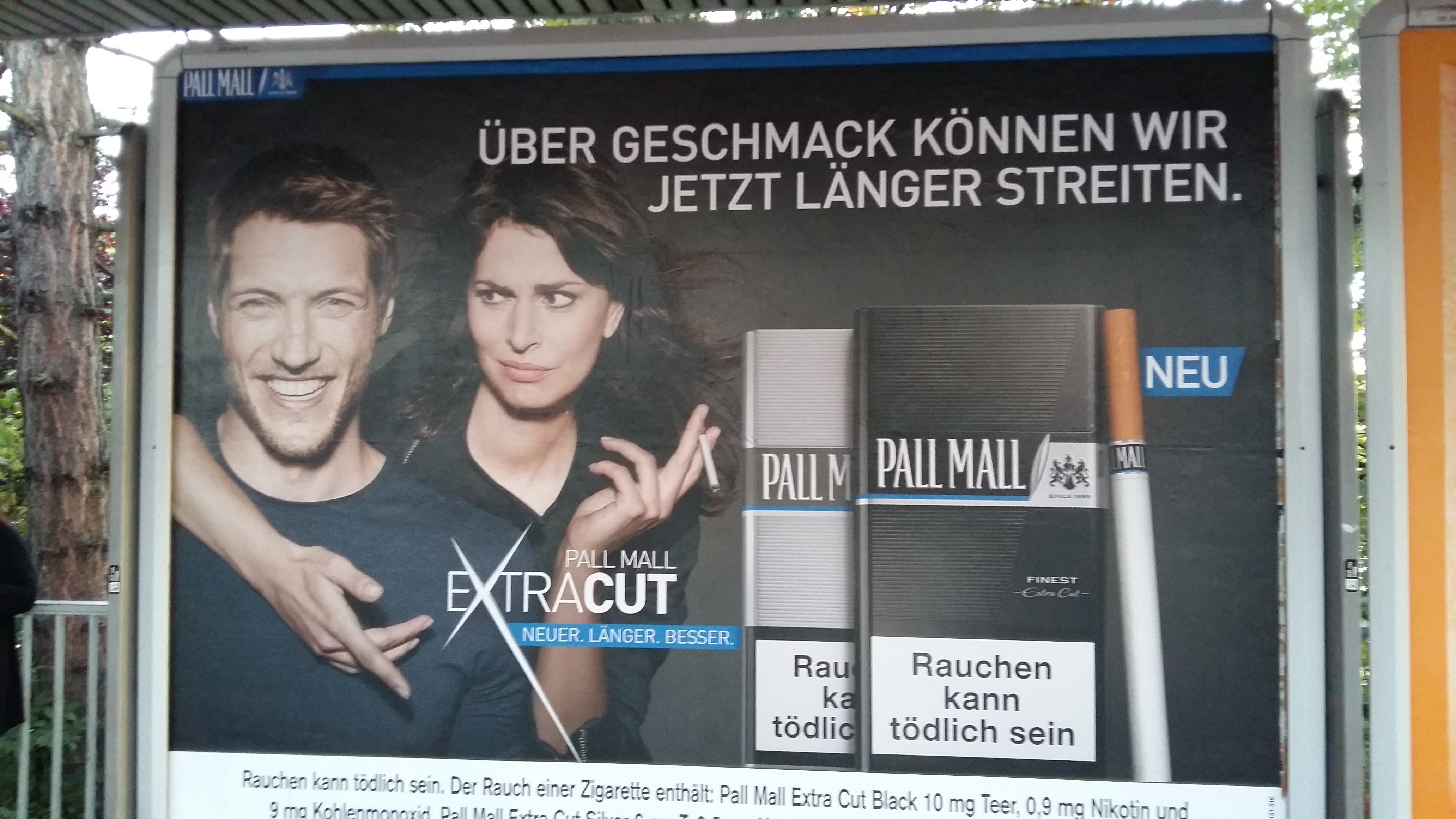 Pall Mall seems to be visiting the past with a series of advertisement posters in Germany for their equivalent brand, Extra Cut (above left). The strapline translates, I think, as “about the taste, we can argue for longer”. Though the extremely intelligent and witty people at the ad agency don’t really think that the couple in the picture are arguing about the taste. One can tell by the expressions on their faces, I think. He’s just being a cad. She’s having a fag because he’s a cad. Never mind, there is always death to look forward to. That will give them something to argue about. Not much pleasure there.