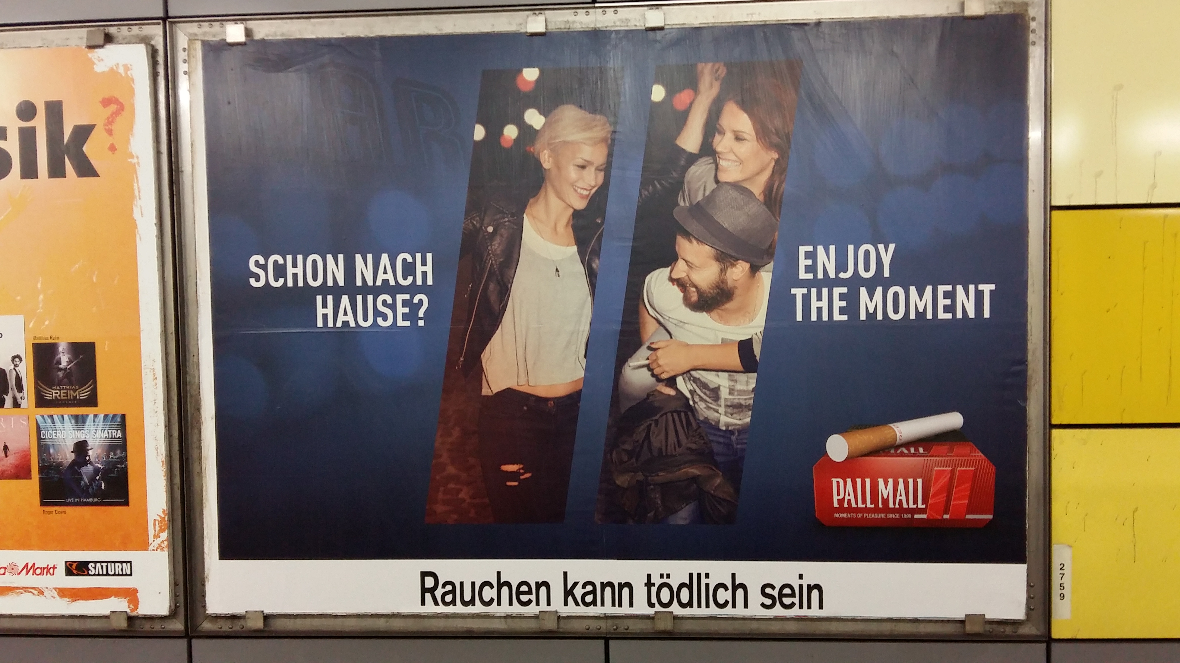 There has been a recent addition to the Pall Mall Enjoy the Moment campaign. Here we find two women, one with a cigarette, and a man giving the smoking woman a piggyback ride. The strapline “schon nach Hause” translates literally as “already at home”; naturally we enjoy the moment.