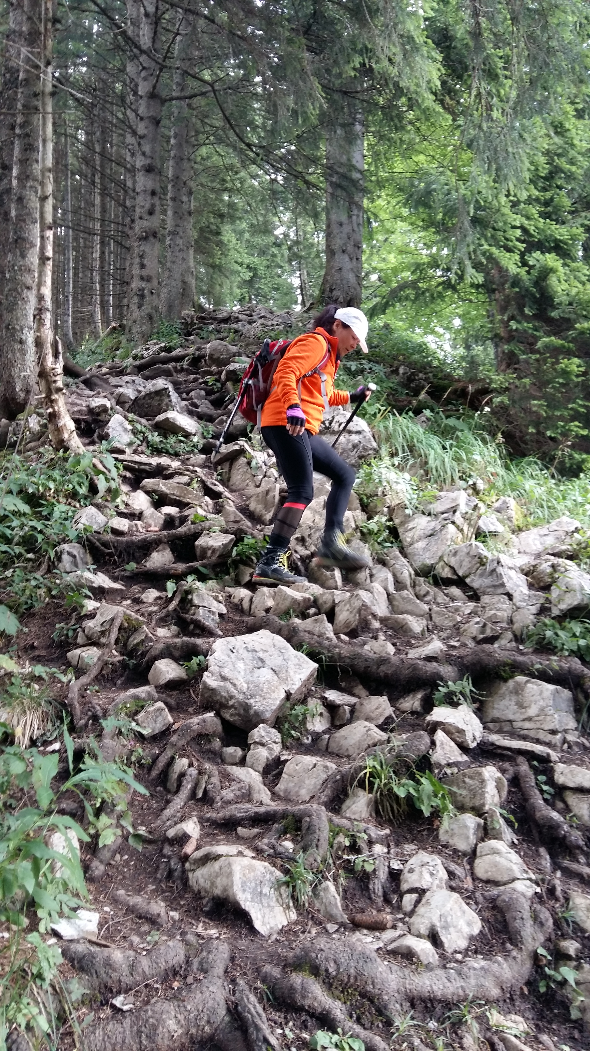 The first part from Neuhaus to Bodenschneidhaus (a welcome Alm eating house) is pretty simple – though the gradient is not trivial. The path is well defined and and made of stable gravel. However, from thereon, if the plan is to go to the summit, the path becomes less well defined and variously slippery, steep and ambiguous. At times of heavy rain, I suspect it becomes a river (left). At one point, the path is made up exclusively of exposed tree roots.