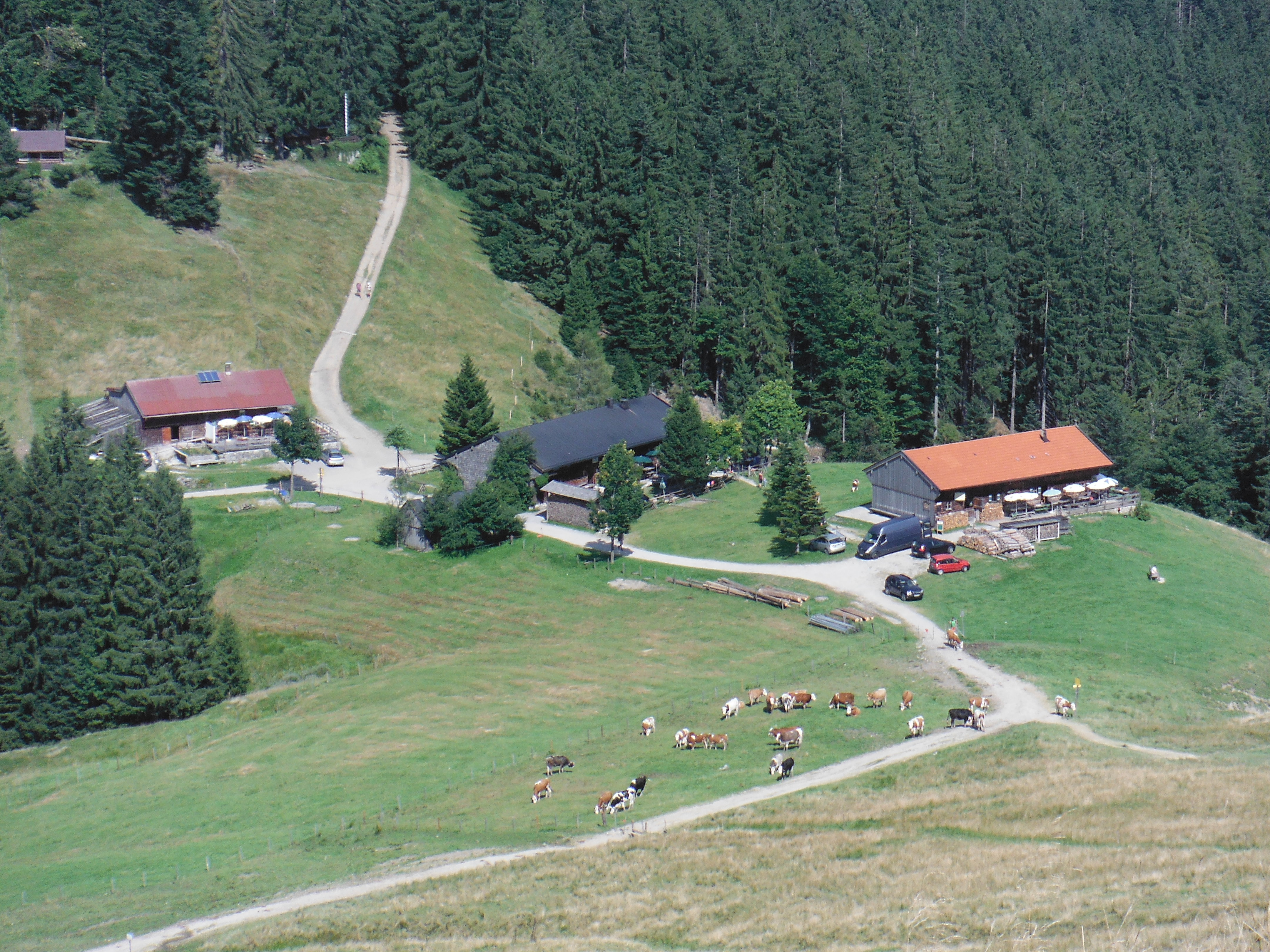 s through the forest and emerges for a 30 minute ascent to Gindelalmschneid. The view to the north looks to the flatlands towards Munich (just visible on the horizon). The Alm is tucked in to the landscape below the peak (right). We took food with us and enjoyed it on a bench next to the Crucifix, the ever-present feature of alpine peaks.