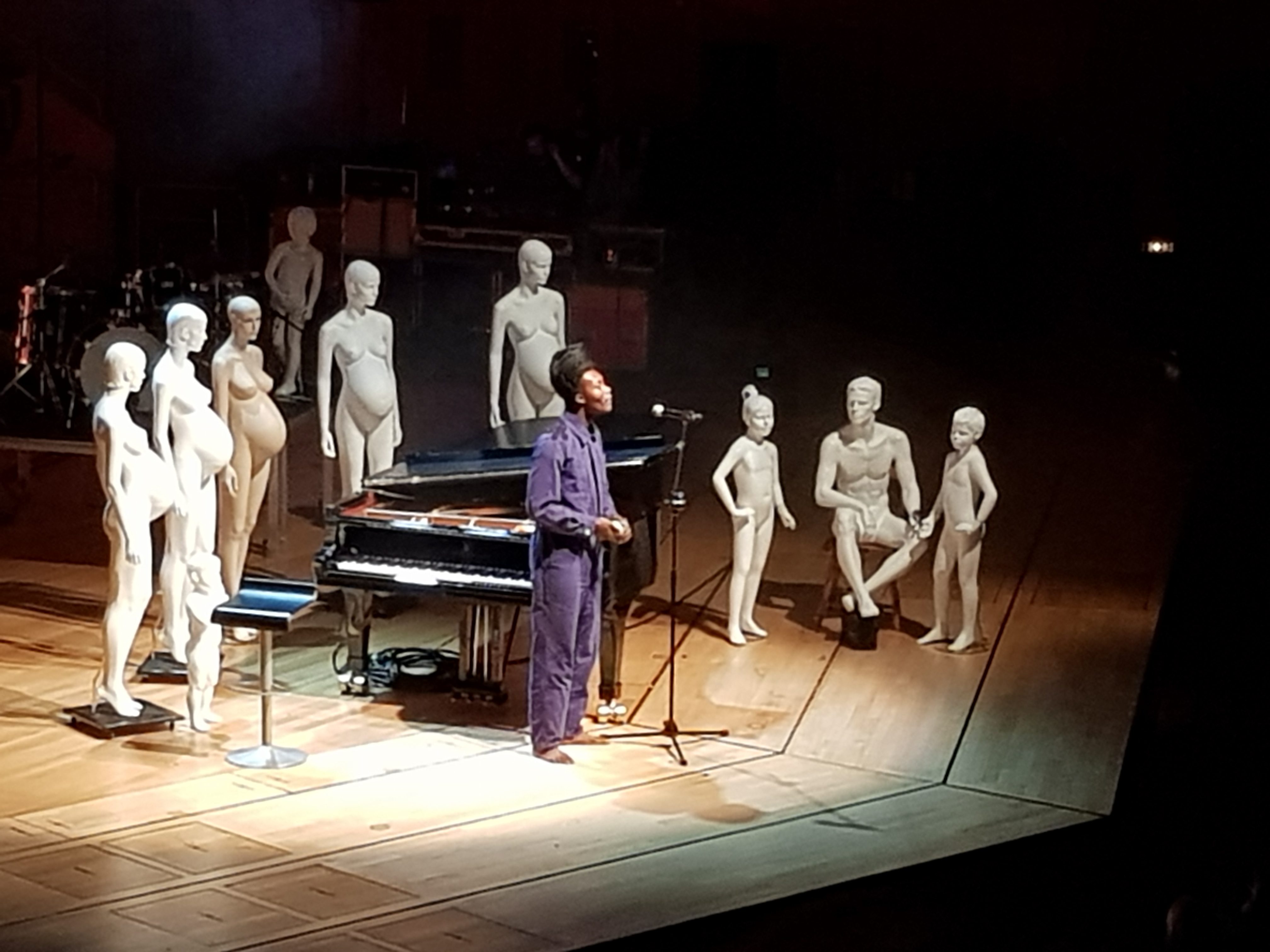 He then appeared on Later with Jools Holland October 2017; a necessary launchpad for a new work. His performance was, to say the least, unusual. He was joined by his long-term percussionist collaborator, Alexis Bossard and a bunch of clothes-less mannequins. They seemed like a major distraction; not least because some of them were children. So, on entering the auditorium of the 2700-seat Munich Gasteig, a shiver went down my spine when 13 mannequins, the majority representing pregnant women, were dotted around the stage.