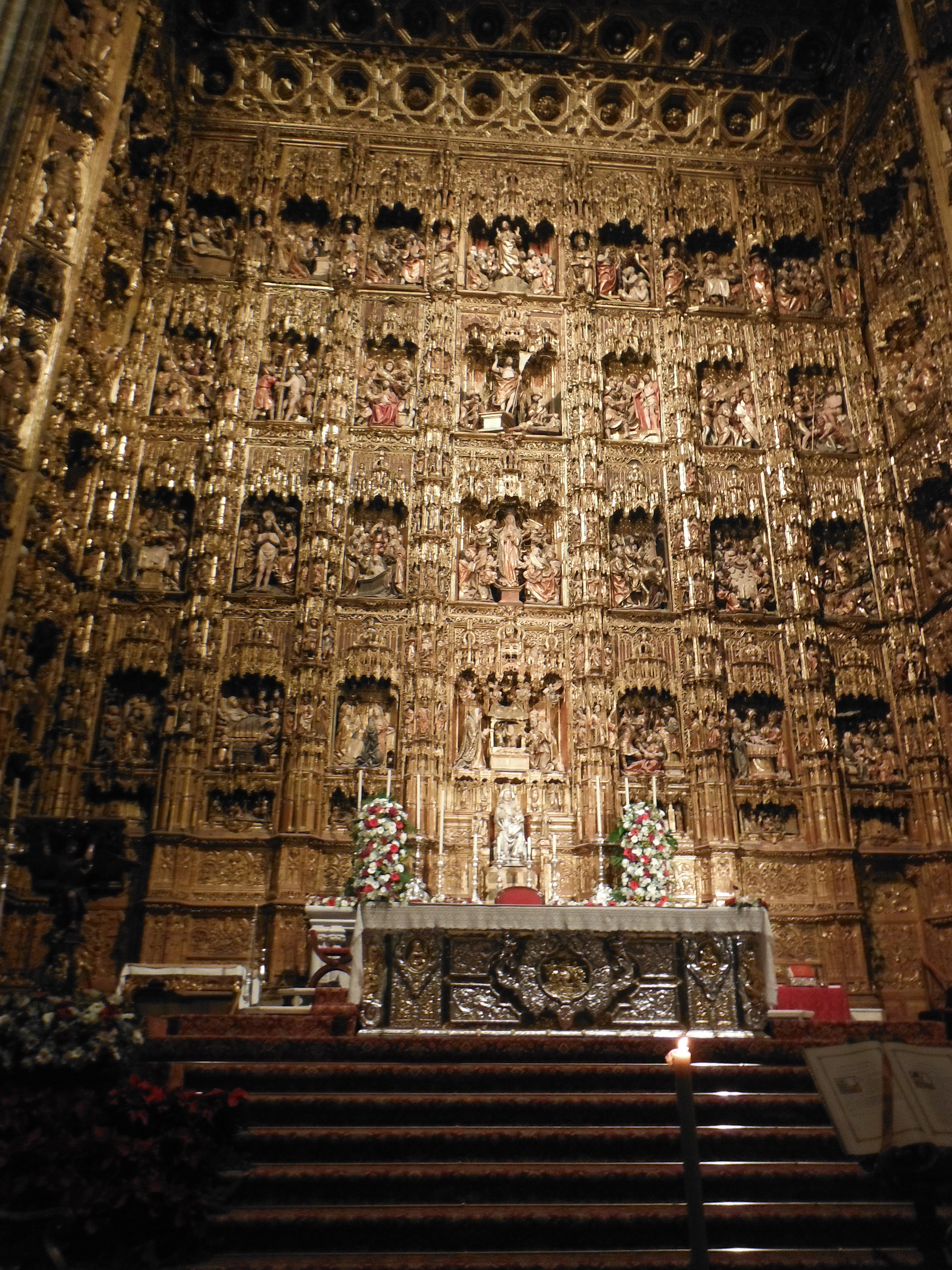 Adjacent to Columbus one finds – what my guide describes as – the masterpiece (right) of the Cathedral, the central altarpiece (Capilla Mayor). This is debatable. It is certainly impressive and is, apparently, the life’s work of the sculptor, Flemming Pieter Dancart. There are 45 carved scenes of the life of Christ, intricately carved and guilded. Unfortunately it is defended by an enormous iron gate (as are many other altarpiece in the cathedral) which really prevents one from studying the panels in any meaningful way.