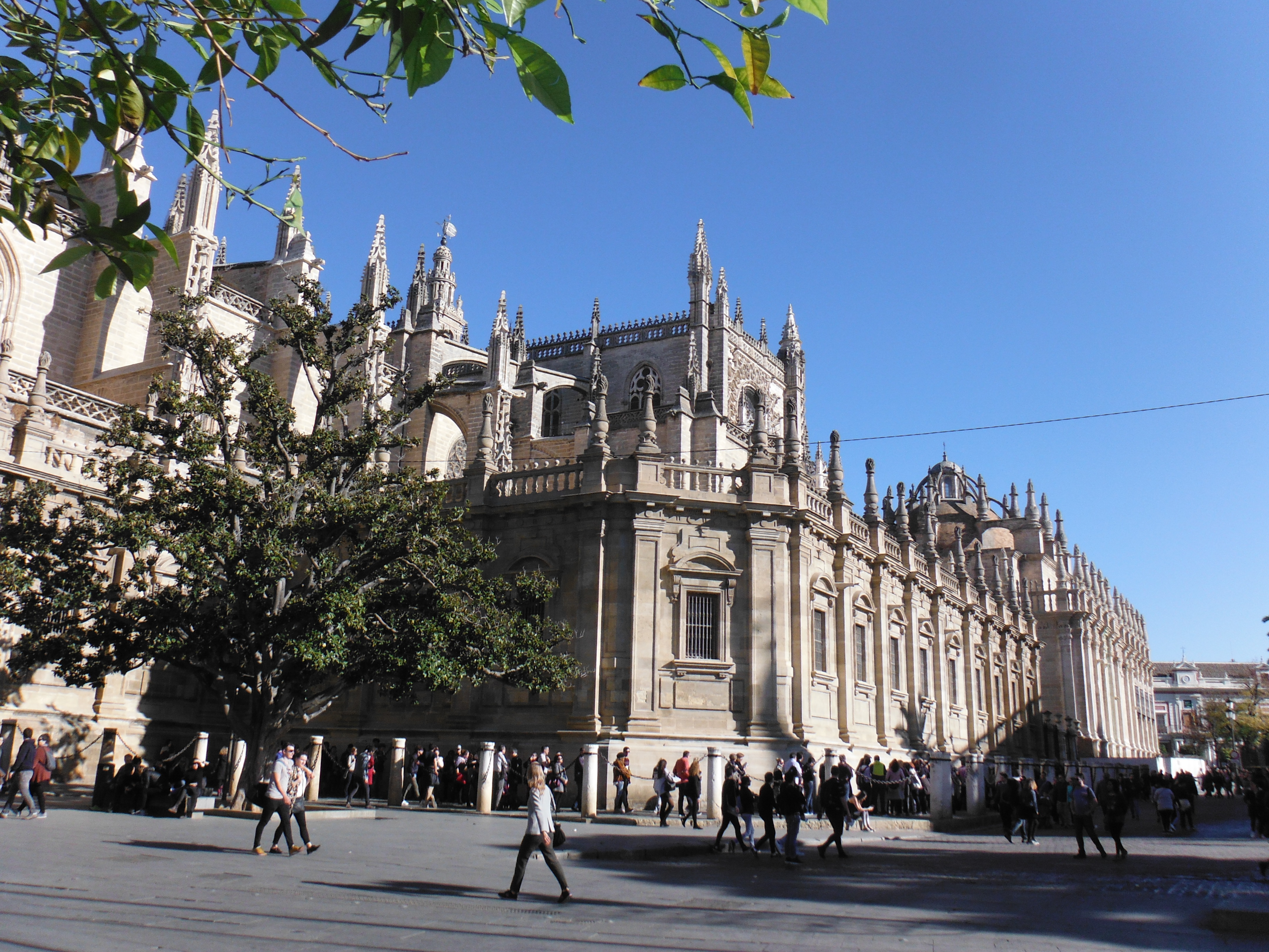 Seville is the location for the largest cathedral (left), by volume, in the world. It’s gothic old, dating from 1506. Expect to queue to get in – it took us about 30 minutes. But once in, there is plenty of space for all. And more.