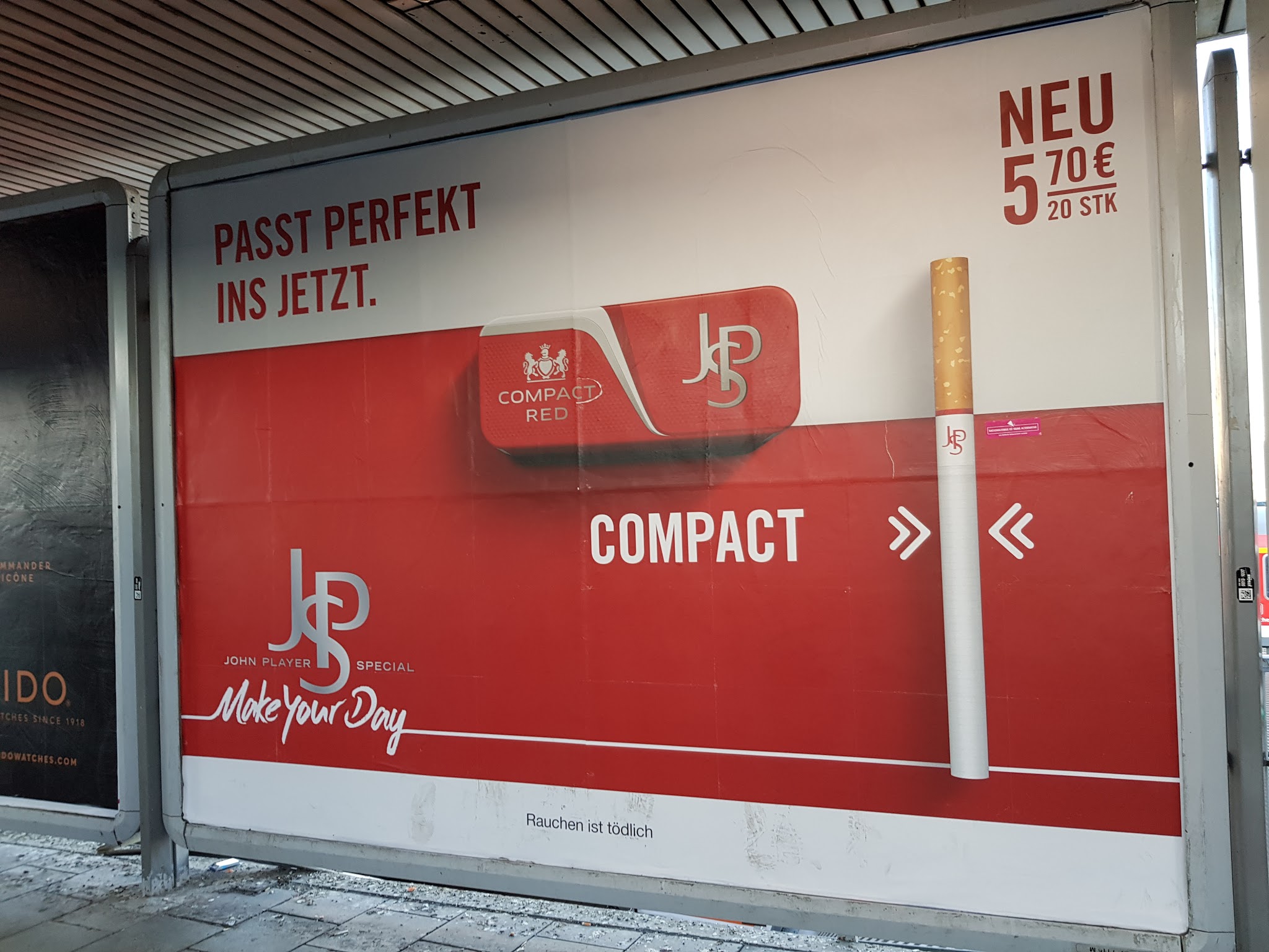 John Player Special is trying to knock us over with its striking new campaign, Make your Day. There’s a lot of red. It is supposed to “fit in”, as the strapline indicates. Because it is compact! What is a compact cigarette? More tobacco? If so, the bit they do have to put on the poster “Rauchen ist tödlich” is as fitting as ever. Deadly.