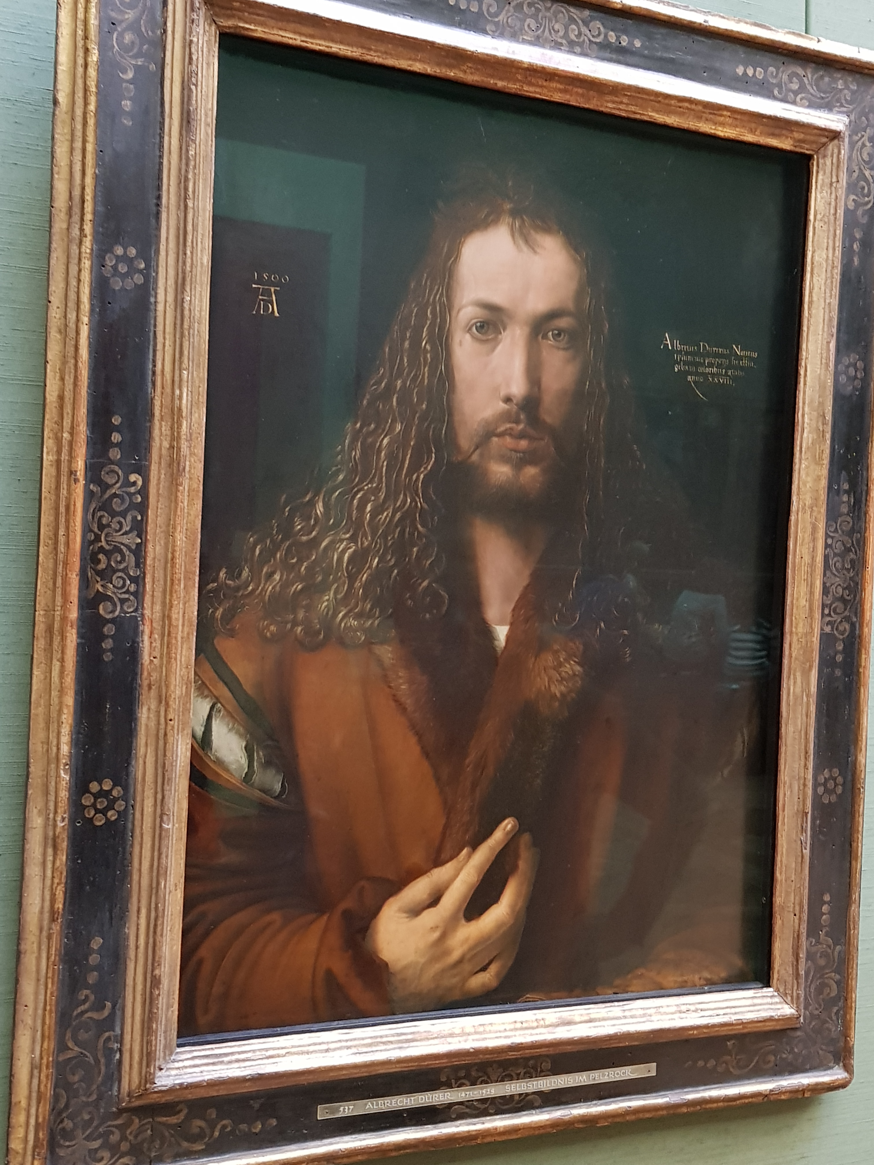 It is only when one is a regular visitor to galleries that one discovers just how much time they spend being refurbished. Sometimes it is a big-bang approach where the gallery itself is just closed. The most recent extreme example was the Rijks Museum in Amersterdam with its 10-year extended closure (originally scheduled for 3 years). More subtly, bits of museums get refurbished, such was the case with the Alte Pinakothek in Munich. The previous attempt at meeting up with the 15/16 Century german artist, Albrecht Dürer, was thwarted. Last weekend we got to make eye contact through this exquisite self portrait. What a figure he makes. I have always liked his personal logo, seen here on the top left. Brand Dürer, 1500.