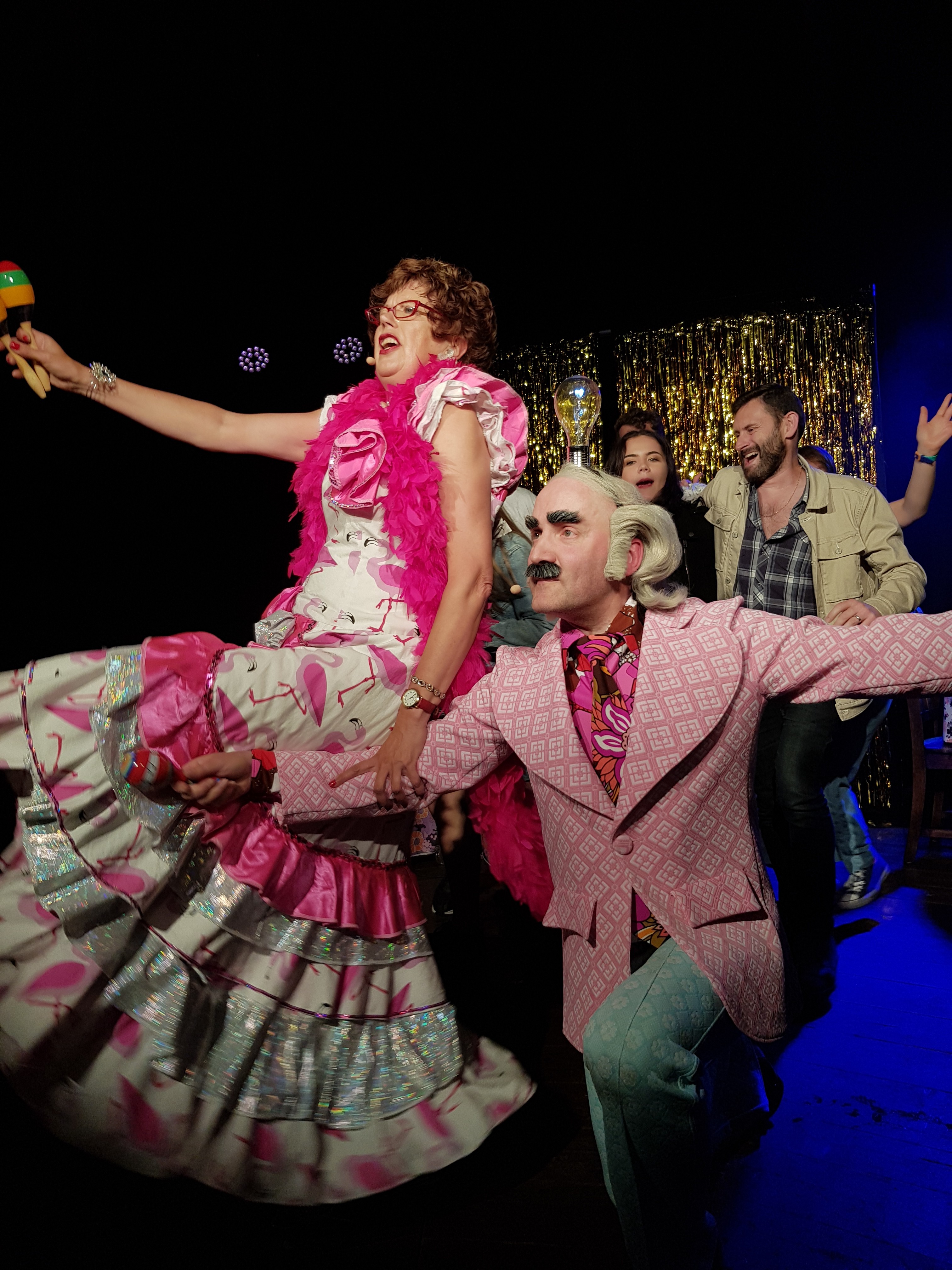 Our host, Boogaloo Stu (Derek Daniels, left) played the ubiquitous night club compere of the 1970s. He was accompanied by pianist, Ronnie Hazelhorn (the surname might be wrong, but I presume he was named after the ever-present 1970s composer, Ronnie Hazelhurst), who was a sensation. On entering the auditorium, everyone received a bingo card and a pen. The card had a combination of 1970s song titles (for example, Save all your Kisses for Me), advertisement jingles (A Finger of Fudge) and Shakespeare plays (Hamlet). Daniels sang all of these as he waited for a line, then two lines, and finally a full house to be called. It was a live “Stars on 45” medley. For those of us who lived through this decade, it was wonderfully cringeworthy. As the words came so easily. There was also a section called Shakespeare or Shakin’ Stevens. This was more difficult than it sounds!