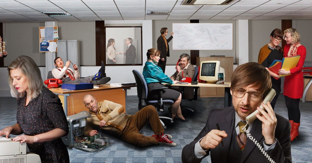 seems dated around the early nineties, though references to zero-hour contracts and copies of the Human League’s Dare album as part of the cover art suggest a certain temporal confusion). A telephone receiver is used as a percussion instrument (right).