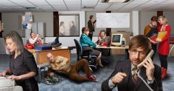 OK, so to the show. The set has a very large clock hanging behind the players. There are two doors, one in, one out. There is a desk with an aged monitor sitting on it (the office is