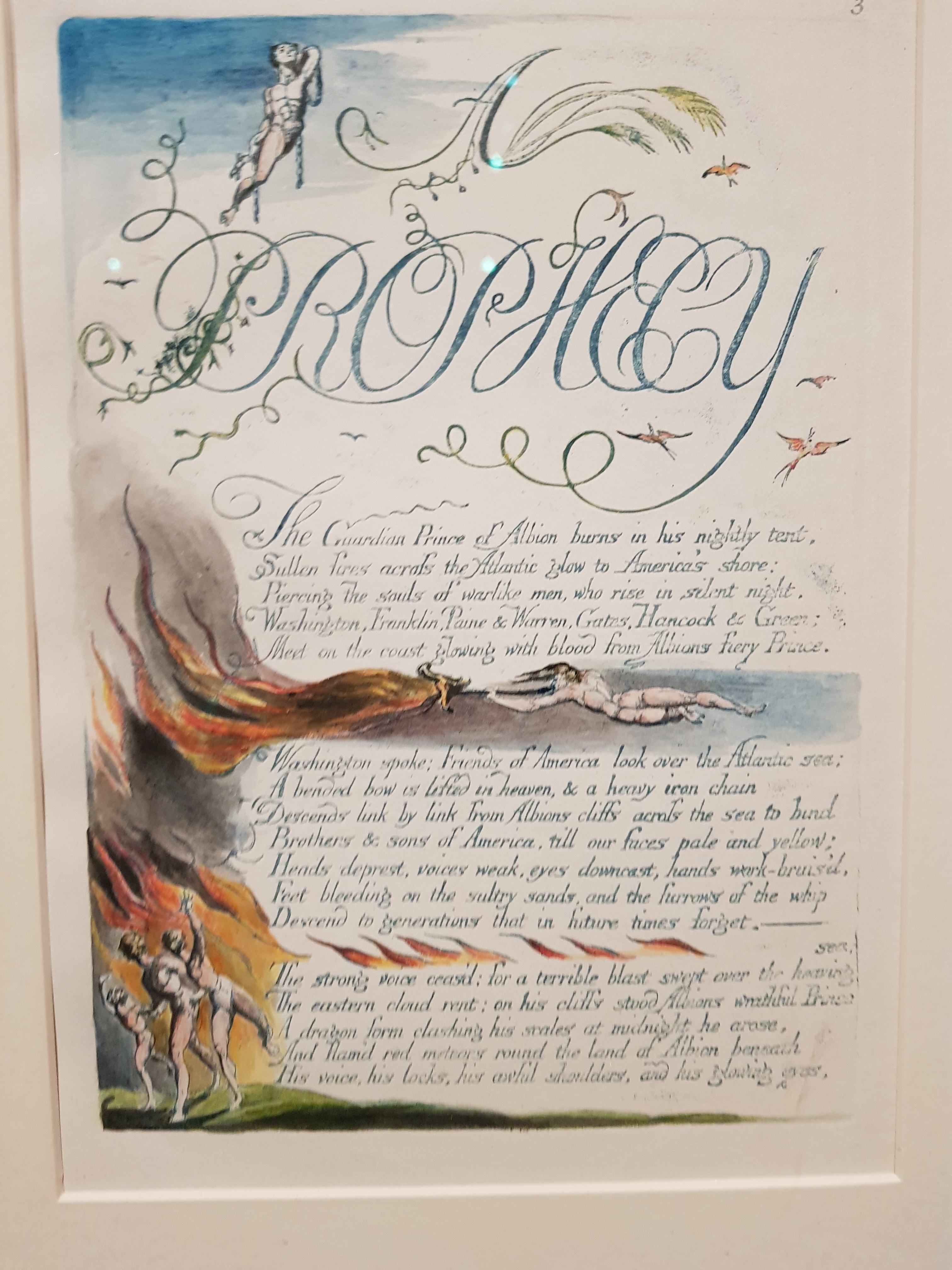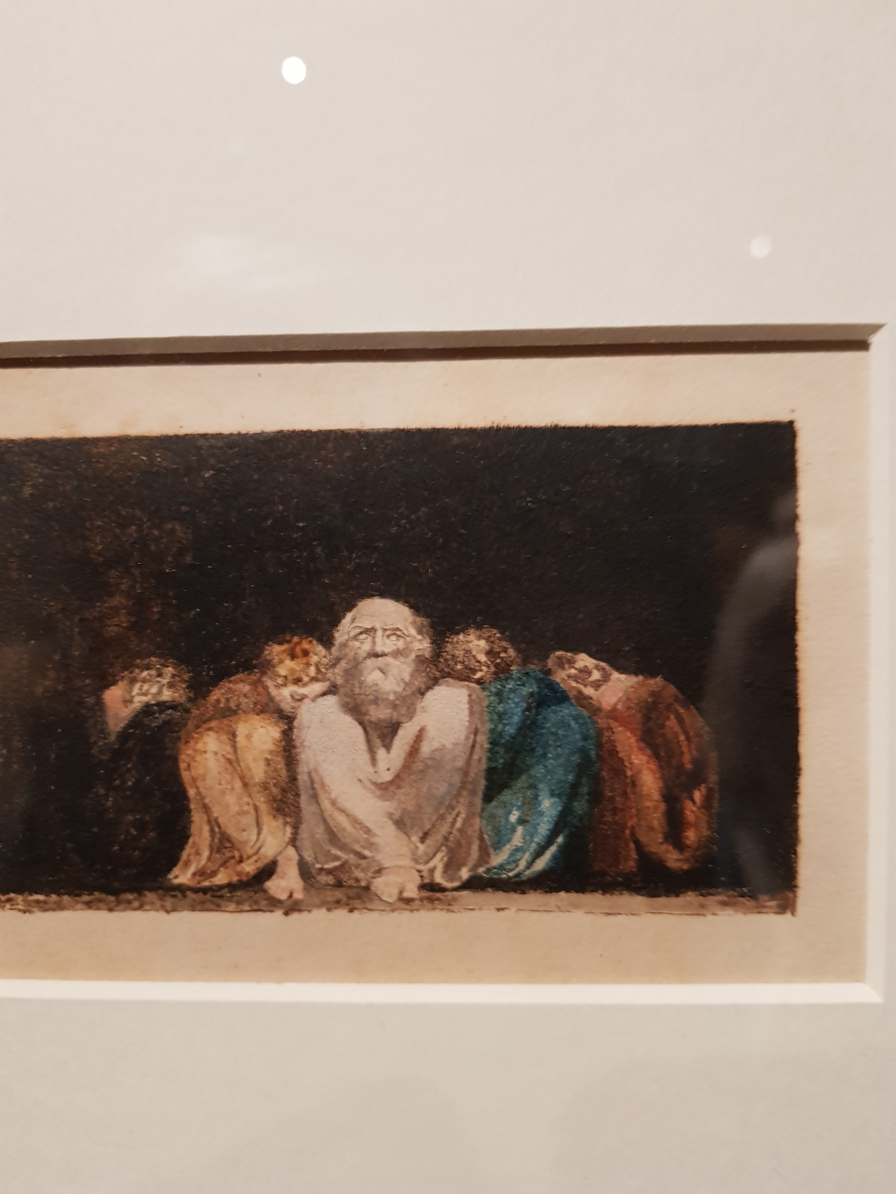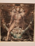 I did not know much about William Blake before this exhibition, still popular despite starting on 11 September, though no booking is needed now. It is walk right in. So, Blake was an illustrator/poet/artist. He innovated technique (“tacky ink applied under pressure”) and created some curious juxtapositions including the Pope and the Devil together in Hell (1794-6, right) – Blake was devout, but obviously not catholic.