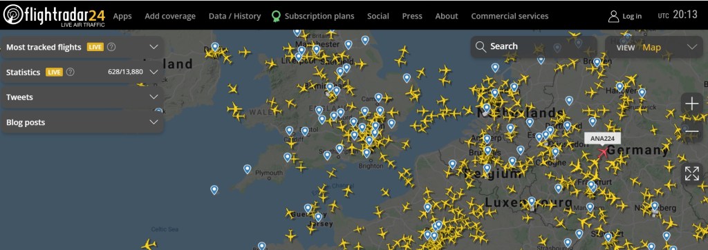I calculated that to offset the emission caused by 100 desktop computers, we need to plant nearly 5 football pitches of trees per year to absorb the carbon. Imagine that scaled up to airlines. Just see how many aeroplanes are in the air currently – February when volumes are low and even lower because of reduced demand and capacity (right).