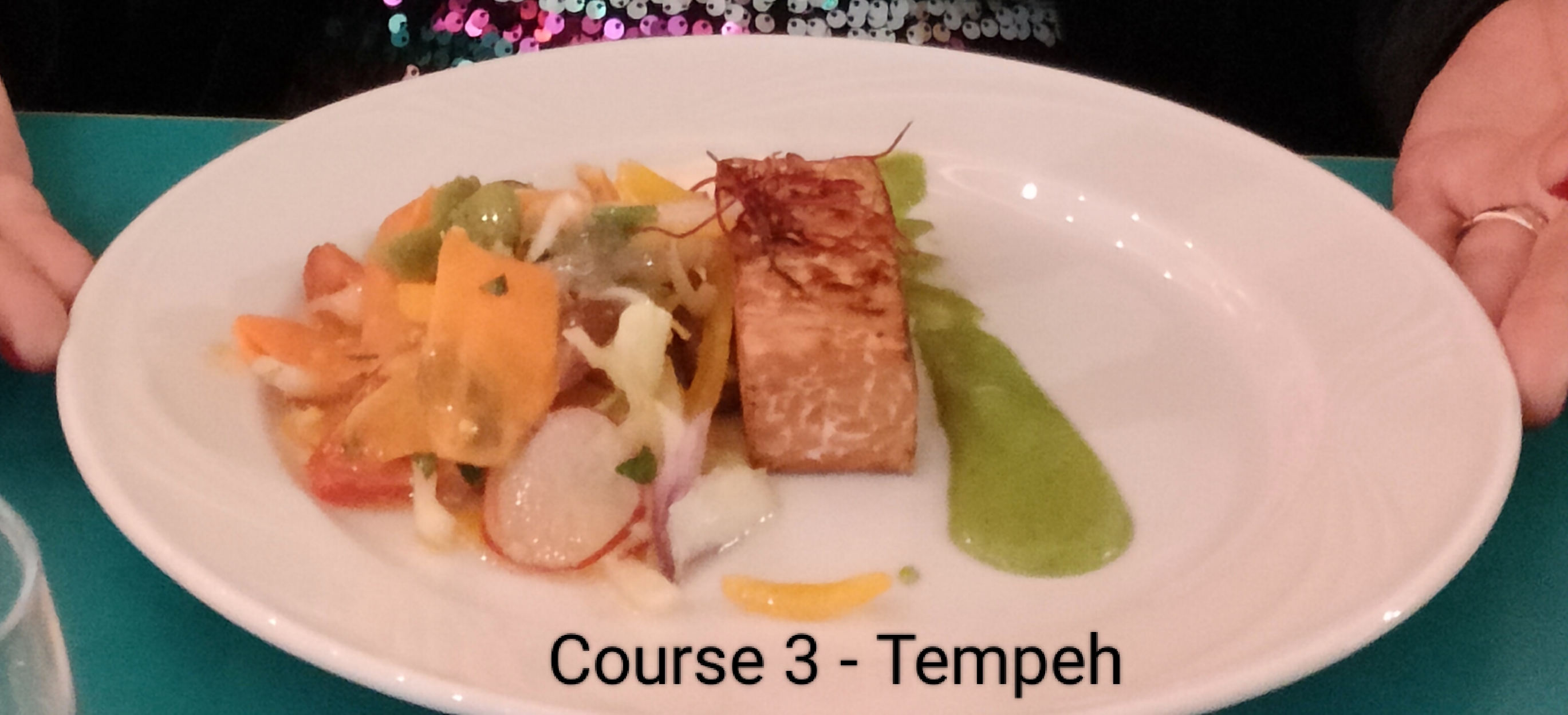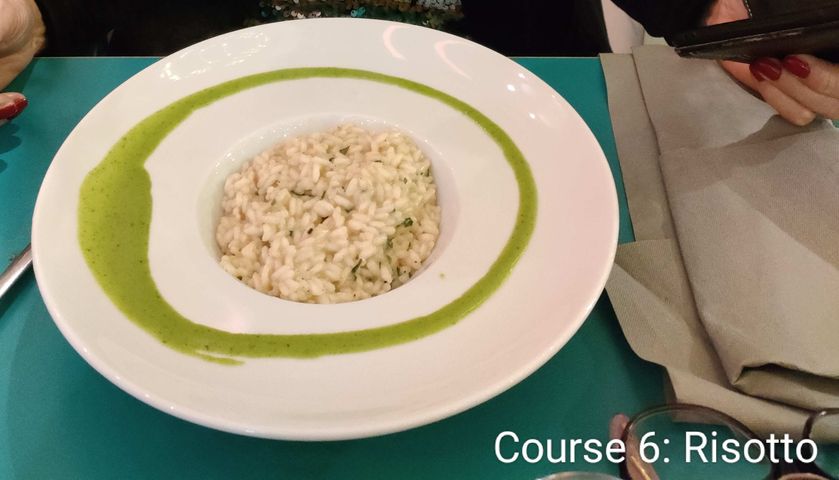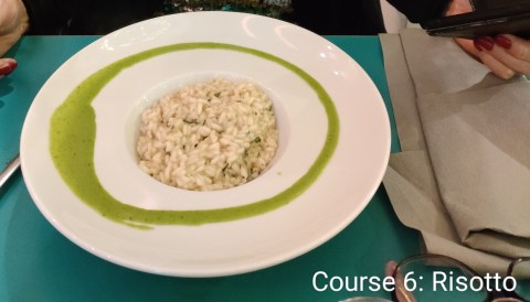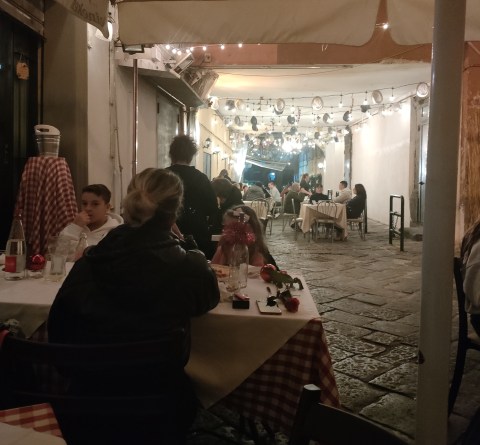 In fact, we had many eating experiences. There are a couple of vegetarian options. Both good, one less friendly than the other. Friendly was Cavali Nostri (left). This place was not a concession to vegetarian food. Whoever runs it knows what is vegetarian food. So good the first time that we entrusted to them new year’s eve. We knew there was a special menu, but we had not quite digested the fact that there would be nine courses. Nine! And course 6 would be risotto – a meal in itself. Still, we got some of our new favourite vegetable, friarielli broccoli. Not really broccoli. More like tough and chewy spinach.