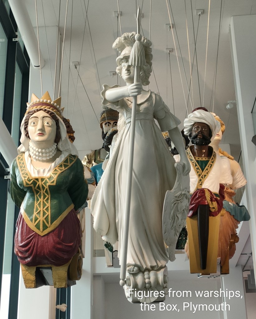 The Box is everything a municipal museum should be. It is full of the place’s history – however (in)auspicious it may be. Plymouth certainly celebrates Napoleon’s capture and exile to St Helena as he was quite a tourist attraction when he landed. Immediately inside the box the grand figures that guided the town’s ships now hang from the ceiling (above left). It also has temporary displays in its magnificent galleries. We enjoyed very much a display of work by (Sir) Joshua Reynolds, a locally-born portrait painter of the rich. The I’m no expert, but the pictures a fine works, at scale and full of questions that artists pose because they can. One big question is around the identity of the black woman in his picture of Lady Elizabeth Keppel (painted somewhere around 1762, right, after at least two live sittings compared with Keppel’s eight). The question is asked for two reasons, first, she is not named, but second, she is depicted not as an equal, but neither as an absolute subordinate. Her clothes and jewellery may have been donated by the family, but that in itself is significant such that she can be represented as a woman of status, albeit as a maid servant. The likelihood of Reynolds seeking to represent a black woman as one with status is not high, but it is one of the quirks of art that inadvertently demonstrate more than perhaps intended.