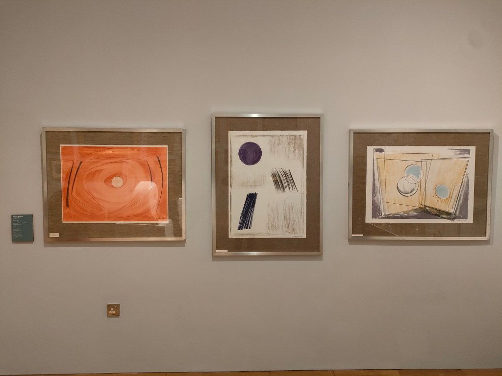 Also, Barbara Hepworth’s work gets a look in. Three paintings (Opposing forms, 1970; Autumn Shadow,1969 and Oblique Forms, 1969) are on display, probably just to point to the people at St Ives, where she lived and worked, they do not have exclusivity. Though with Hepworth, there are many public examples, not least the work, Winged Figure (1963), adorning the side of the John Lewis shop on Oxford Street, London.