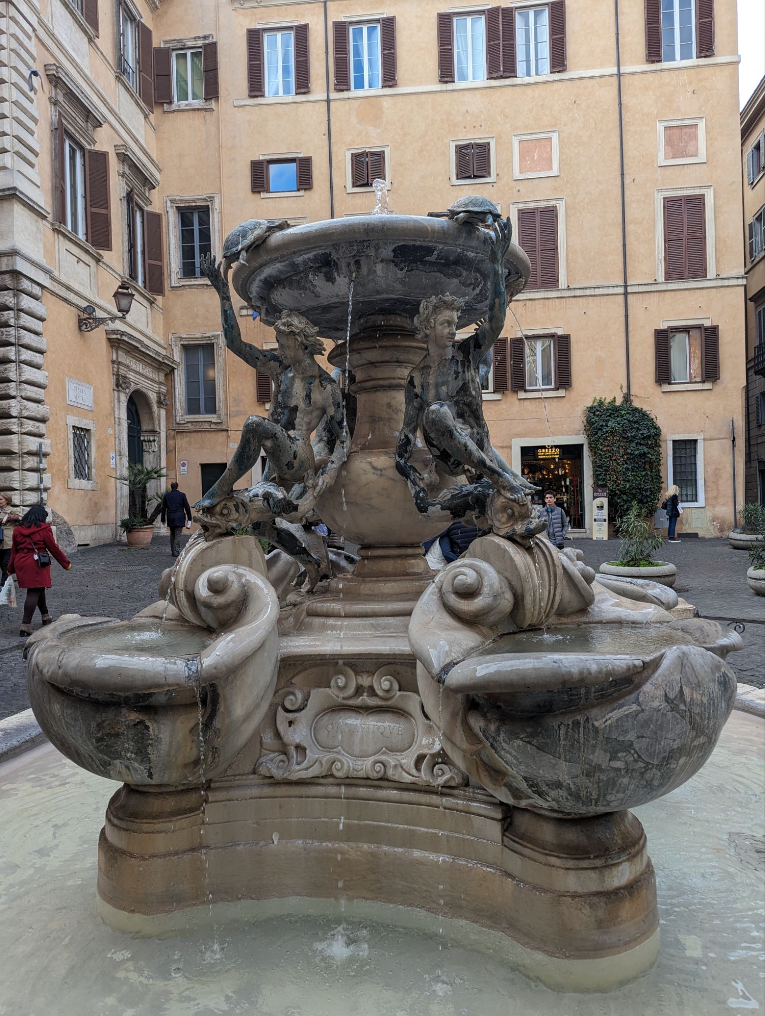 Rome boasts hundreds of fountains. Every square has church and fountain. The fountains are very much part of building civilisation – fresh water, effectively. The example (right) is found close to the entrance to the (former) Jewish Ghetto. It is called Fontana delle Tartarughe – fountain of turtles, I think. If you look carefully, they scale the upper rim! It is renaissance bronze.