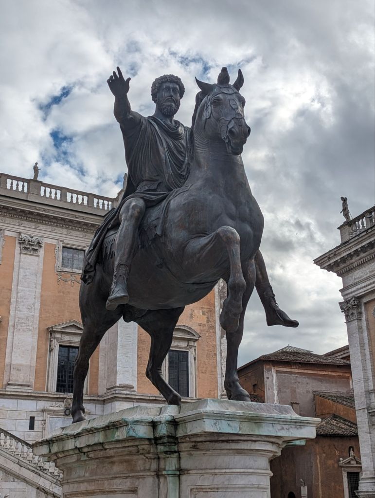 Talking of bronze, the equestrian statue of Marcus Aurelius Michelangelo at the centre of the Capitaloni Square and in front of the Palazzo Senatorio (seat of government) is as bold as they come. It was sculpted in 175AD. It apes the imagery of bestriding – and all conquering – leaders; though his gestures are those of peace rather than vanquish. There are no weapons on display. It is apparently still there by accident (the original is in a nearby museum – this example was erected in 1981). Graham-Dixon suggests that the Pope seemingly thought it was of a more godly leader and hence it survived a great meltdown (of precious bronze).