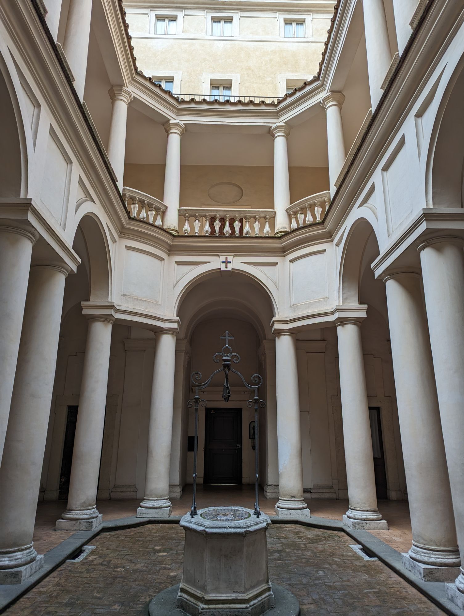 Bernini had rich sponsors, Borromeni did not. And so his seeming Masterpiece – Chiesea di San Carlino alle Quattro Fontane (1638-41) is modest by comparison, but architecturally clever in its use of space and geometry. The ceiling is oval but not, and the light penetrating from the dome adds to the effect. The commission was from an order of Trinitarian monks that did not have much money – or space for that matter. Real skill comes in being able to deliver innovative designs to make the most of what is available. To that end, Borromeni also created a small cloister for the monks. Also modest, also baroque. The balustrade on the gallery is inventive with the pillars arranged in a way that no renaissance architect could countenance.