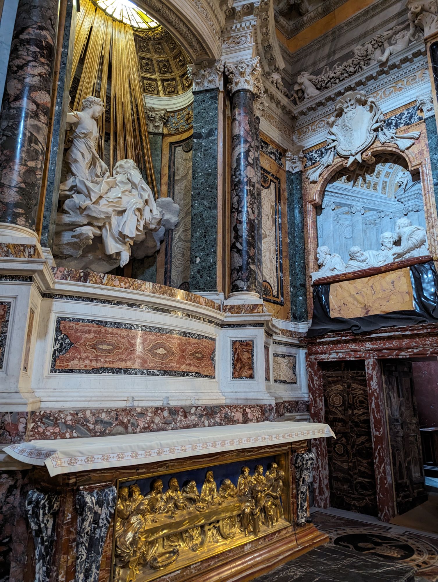 Note also that the scene is being observed as if it were a theatre experience. I am presuming the four men in a theatre box paid for the sculpture (I think they were from the Cornaro family whose chapel the sculpture sits)? And below the whole scene is a depiction of the Last Supper. Almost incidental!