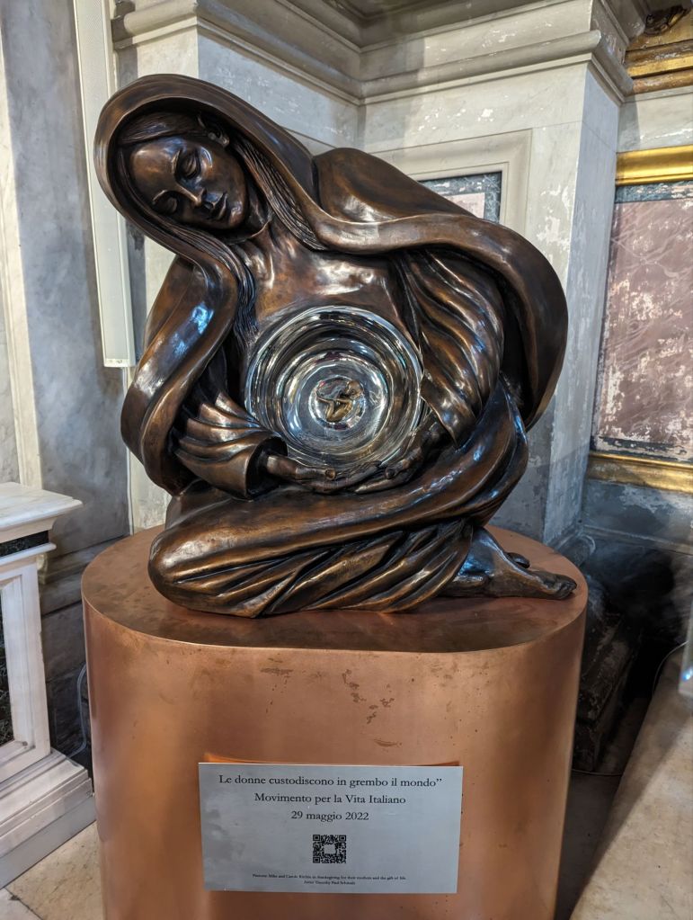 For example, the Church of San Marcello al Corso has recently commissioned some new art work. “Mothers and their Gift of Life” (right) is disconcerting. It is bronze and sculpted by Timothy Paul Schmalz. The woman in question may be Mary, but could be any woman with a baby growing inside her. This one is small (but aren’t they all?). But it is in a dish. I don’t know how to interpret that, but I read it as need and hunger, not the gift of life per se. Very odd.