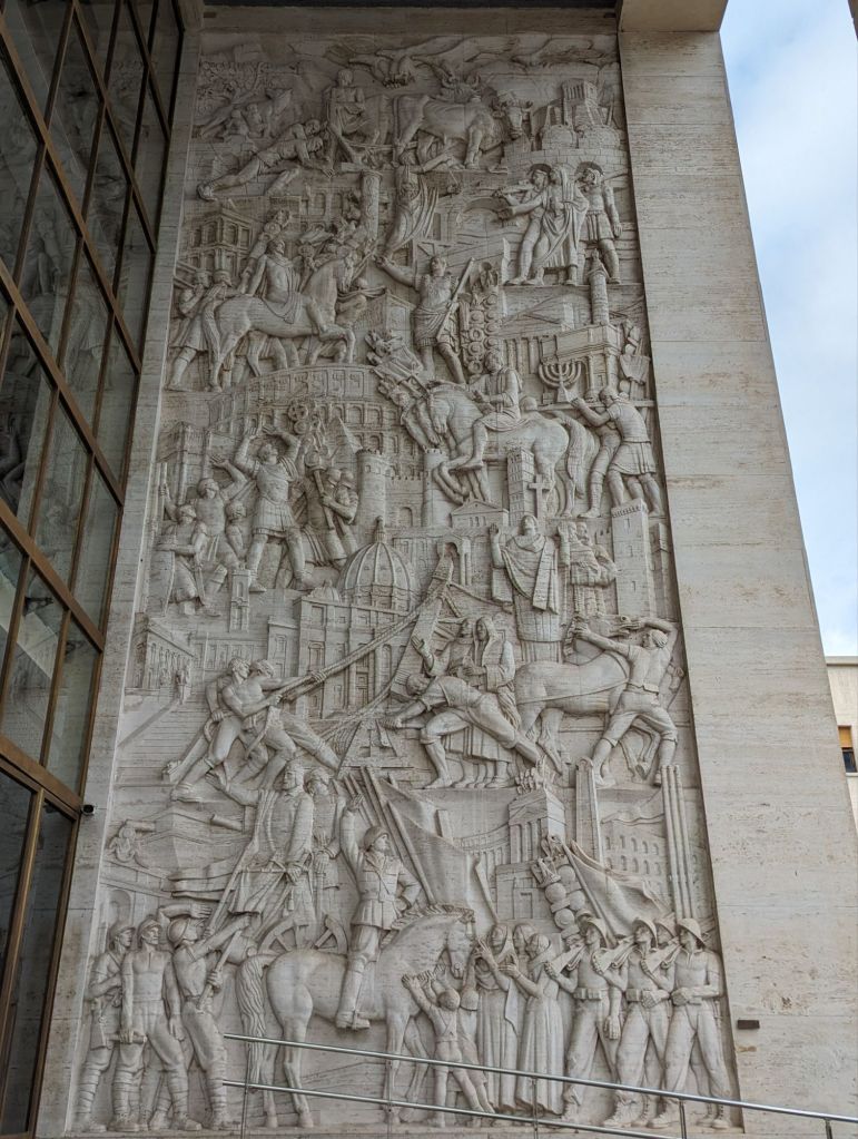 EUR is very much an administrative centre with at least two major offices of state parked there. The Finance Department has a fantastic frieze outside….fantastic in the sense of how it sends a shiver down the spine – Mussolini is depicted as being Mussolini on it. (lRight – first line on a horse).