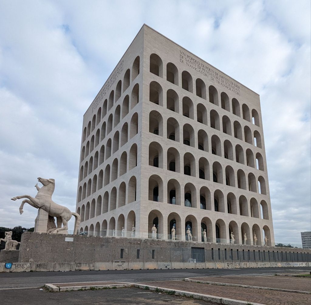 EUR was Mussolini’s attempt in Rome at building a (new) Rome at scale using 20th century materials and techniques. And by goodness, the results are impressive. The neighbourhood is reached on Line B of the metro system. The Palazzo della Civiltà Italiana (left) is visible directly from the metro station, EUR Magliana. It is as striking as anything in the old city. It stands in a fenced-off space with very little in the way of greenery. Like much of Rome, wildlife does not easily cohabit the space with humans. Feral cats do – also not good for birds and small mammals. Unfortunately the building is not open to visitors. Through the entrance door, one can see a big Fendi sign which suggests how the building’s purpose may have changed.