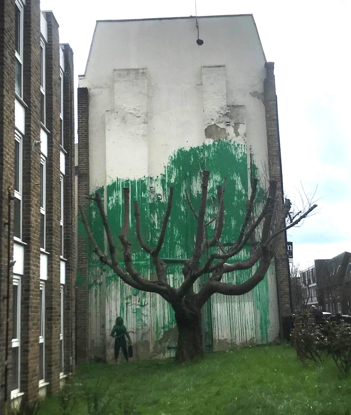 It seems that Banksy, whoever he is, saw the opportunity to provide this sad tree with leaves by painting them – or spray painting them – onto an adjacent side wall. Viewed from one angle, the tree looks healthy and with full plumage. And like all Banksy artwork, there’s a message.
