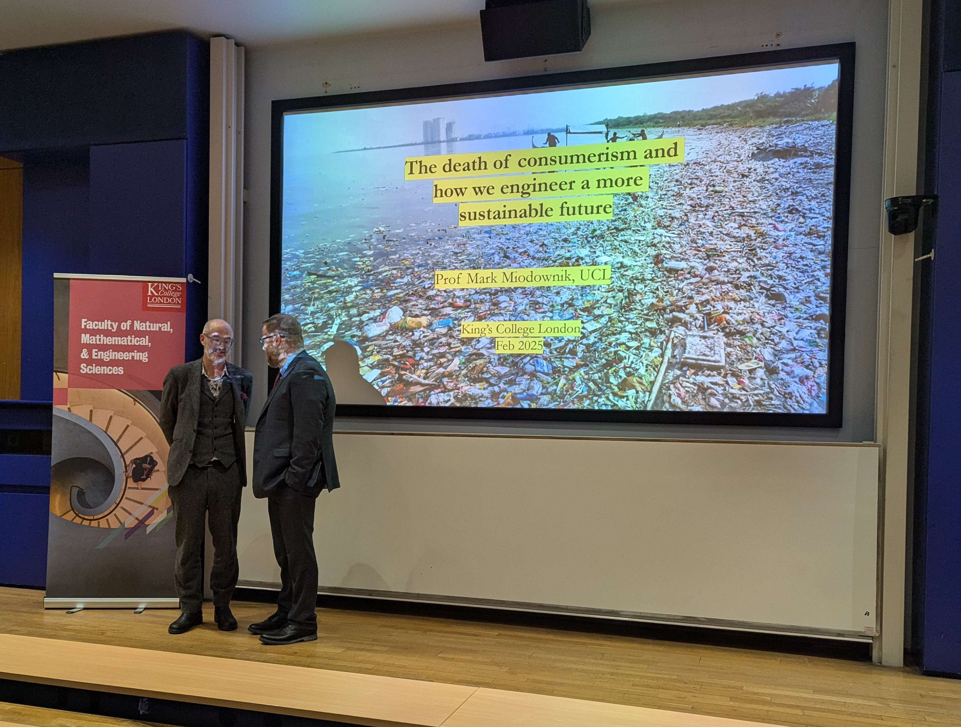 Arriving at the venue, Kings College London, I expected a huge auditorium for such a superstar materials scientist guest as Professor Mark Miodownik (left, with Professor Chris Lorenz*). But the lecture theatre was small, intimate, perfect. Unbeknownst to Professor Miodownik, he has educated many of my undergraduate students with clips from his BBC series, Everyday Miracles, a fascinating history of materials innovation. But that was then.