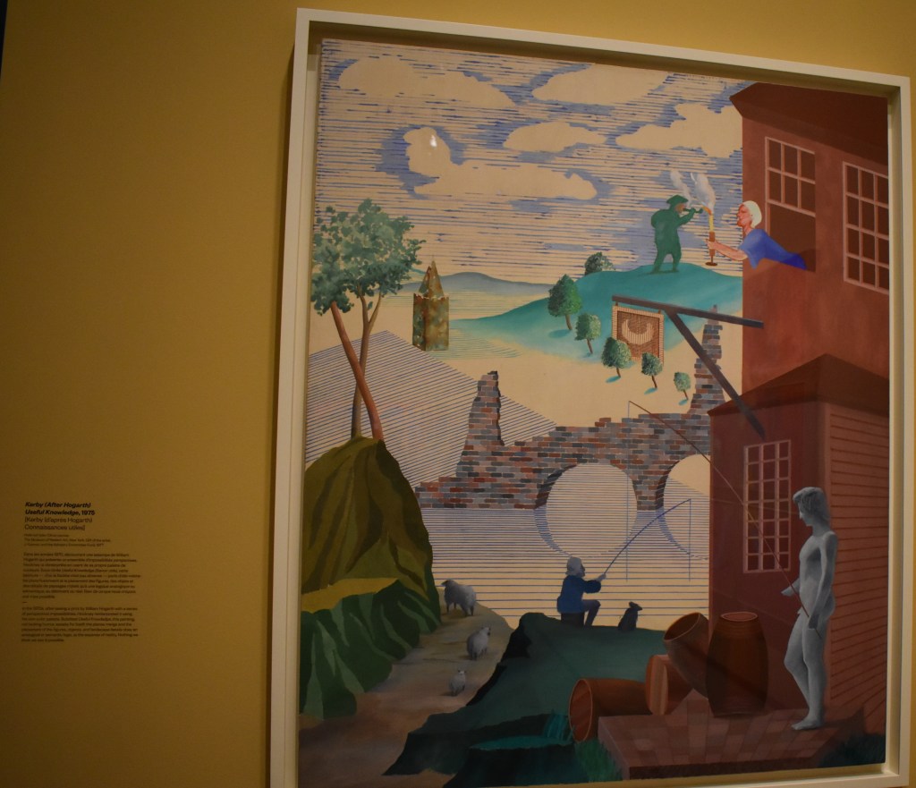 We were back within the hour to a gallery on the second floor which, frankly, we should have started in. This gallery showed what a consummate artist Hockney is and what he could have been had he wanted to be – but that is me being arrogant. I say this because Hockney himself writes on the entry panels that we might think that he has limited styles on which he can draw for his “periods” – all long-lived artists have those, I have come to realise. In this gallery were examples of Hockney aping the styles of other famous artists. There is always a nod to van Gogh, but we did not realise he was a fine cubist artist in the style of Picasso. I particularly enjoyed his take on Hogarth and the illusions generated in his picture, Kerby (After Hogarth) Useful Knowledge, 1975 (above left).