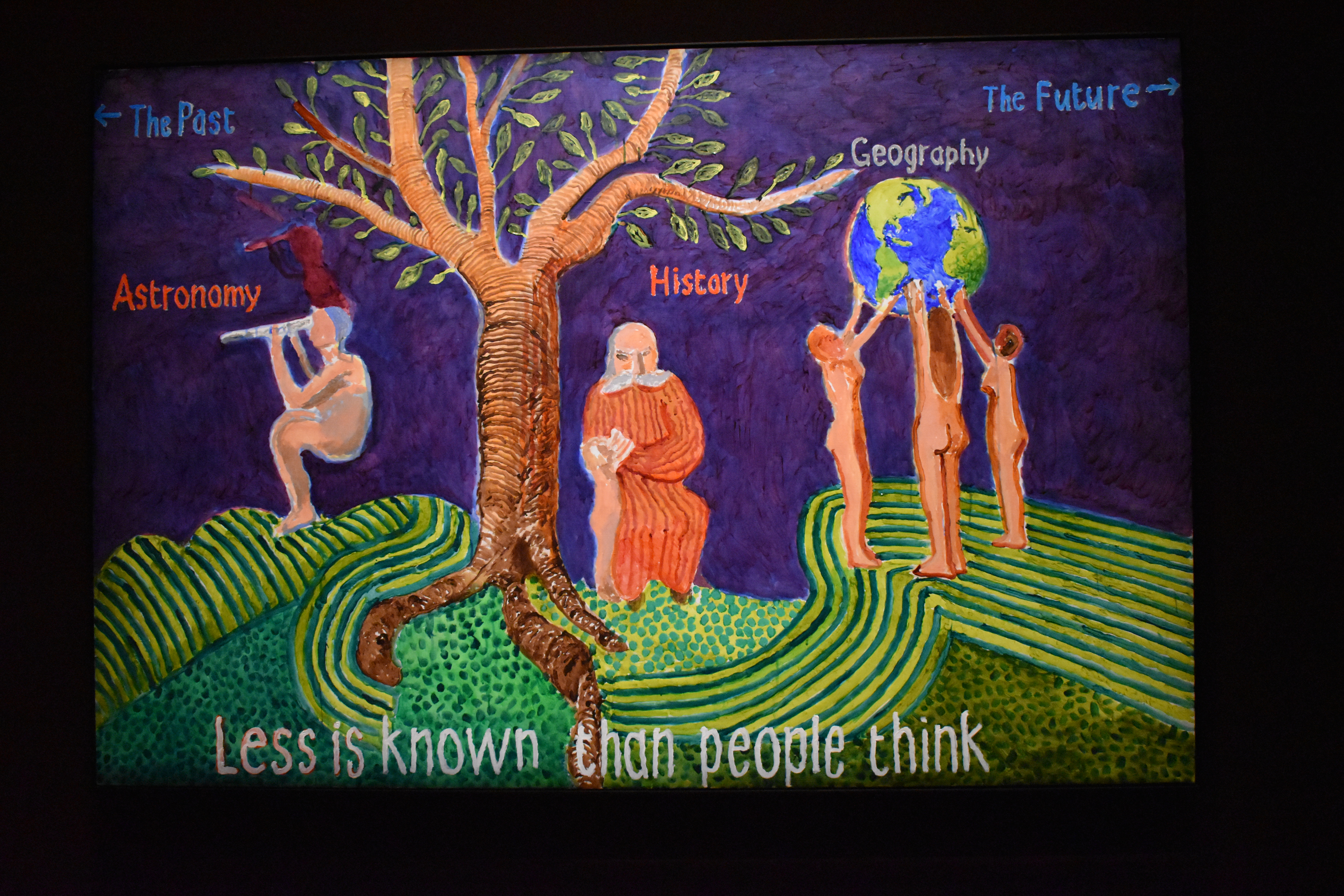 Then on to Munch and Blake (After Blake: Less is Known than People Think, 2023, left). This is the only image that alludes in any way to the welfare of the natural environment (the landscape gallery does not address any of our environmental challenges, indeed reproduces them with straightforward depictions of modern lowland farming). Blake’s painting was a representation of Dante’s Divine Comedy which, admittedly, I have never read. But here we have a holistic view of our human world – a dependence on the natural environment, the awe and fear of the galaxy and universe beyond, human history and a vulnerability (unclothed women holding up the globe) to the planetary system more generally. As we know, we have moved from the Holocene to the Anthropocene – our fate is in our hands, and we ignore the signals at our peril (increasingly decreasing temporality).