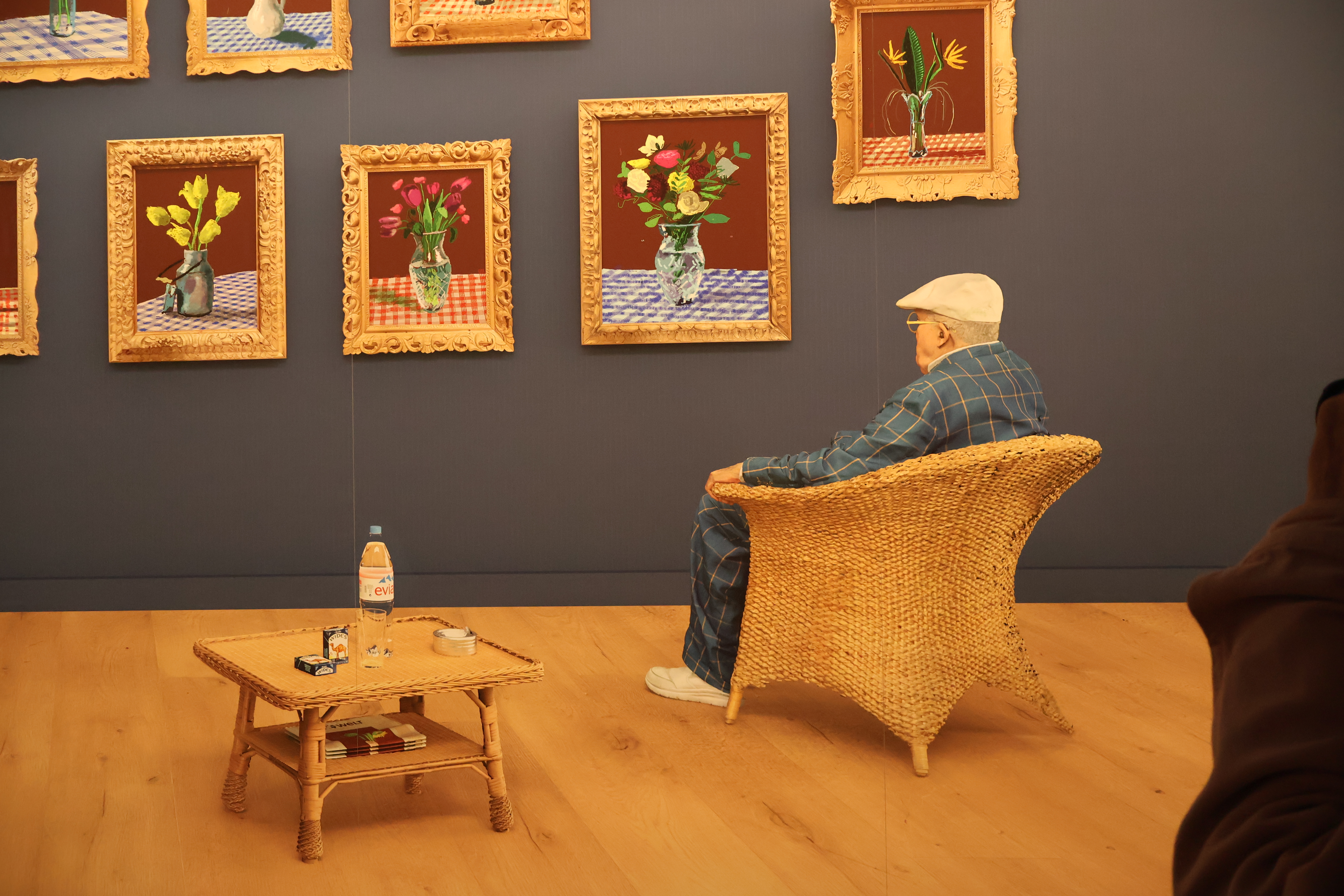More recently Hockney has explored “photo drawing” (right – one of a series depicting the same “event from different angles). Equally in this almost recursiveness is his image of himself looking at his own pictures with subtle references to his own brilliance, such as the edition of “die Welt” underneath the small table (below left). And these, for me, sum it all up. Whilst I concede that Hockney is a versatile artist, able to work in most styles and genres and has a body of work that can fill the Fondation Louis Vuitton building in Paris. He is also just a shade too narcissistic for me really to embrace.