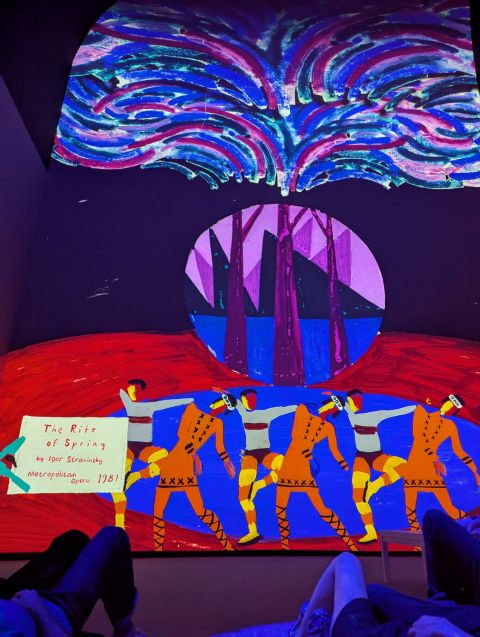 And then there is the theatre work. Hockney was a great fan of opera and throughout his career he has been painting backdrops for some of the great opera houses worldwide. For this exhibition his work is immersive. One enters a large gallery to observe the paintings projected onto walls, with some being animated and involving motion. They are terrific. Another important aspect is Hockney’s experimentation. For example, he has created intriguing electronic pictures that track his method for drawing and painting, particularly landscapes. All credit to him for this. I spent quite a bit of time over these images.