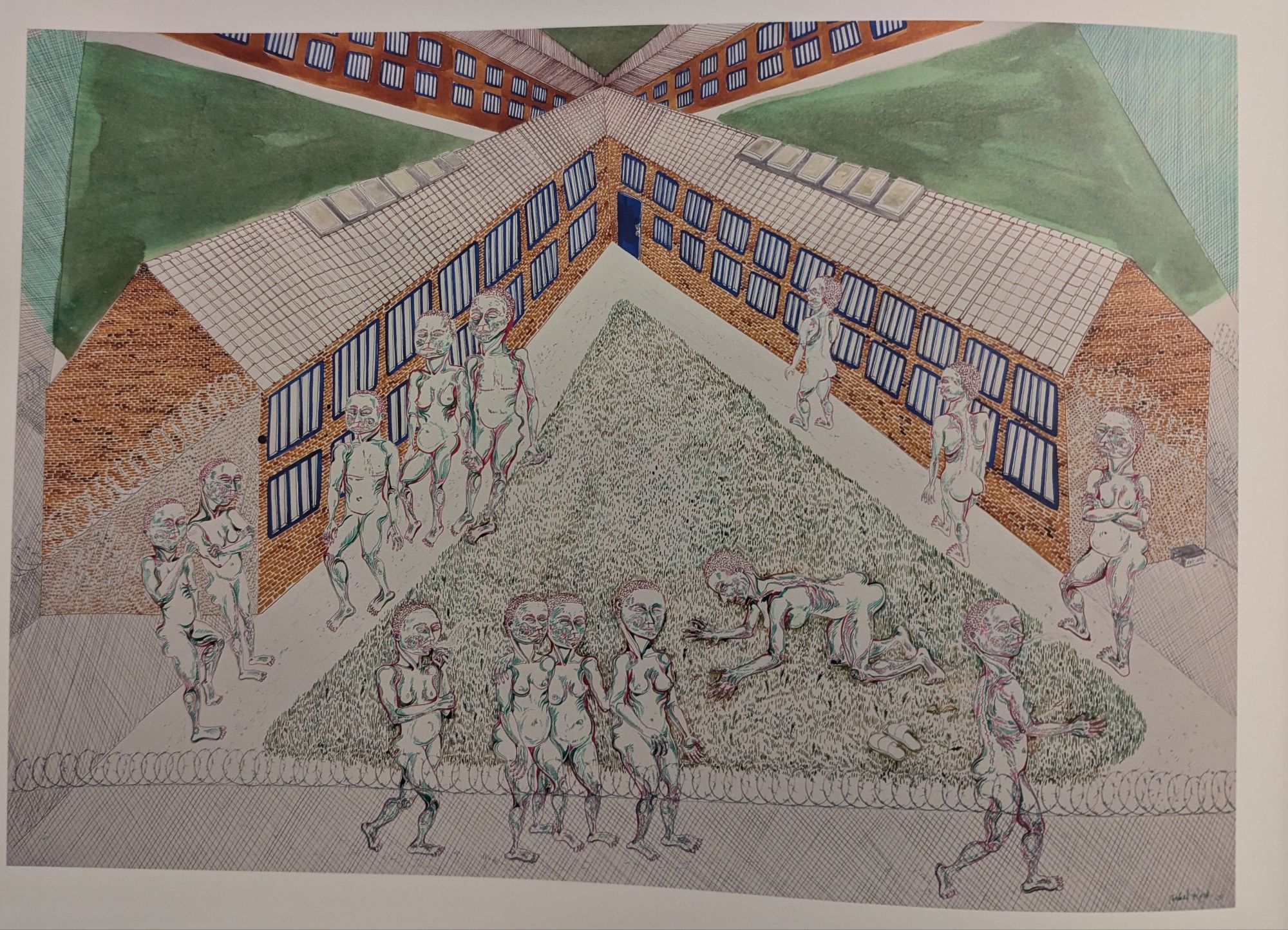 Climate is so important a theme for her that she went to prison for it. She was one of the protestors in 2023 who climbed on a gantry over the M25 motorway in London to Just Stop Oil. Like so many of her peers, she spent some time in prison for that act. When she emerged, she had significant material for her illustrations. All of her inmates are naked. Incidentally, the aforementioned cupboard a replica of her prison cell which she seemingly shared with a giant slug. She was found not guilty, too.
