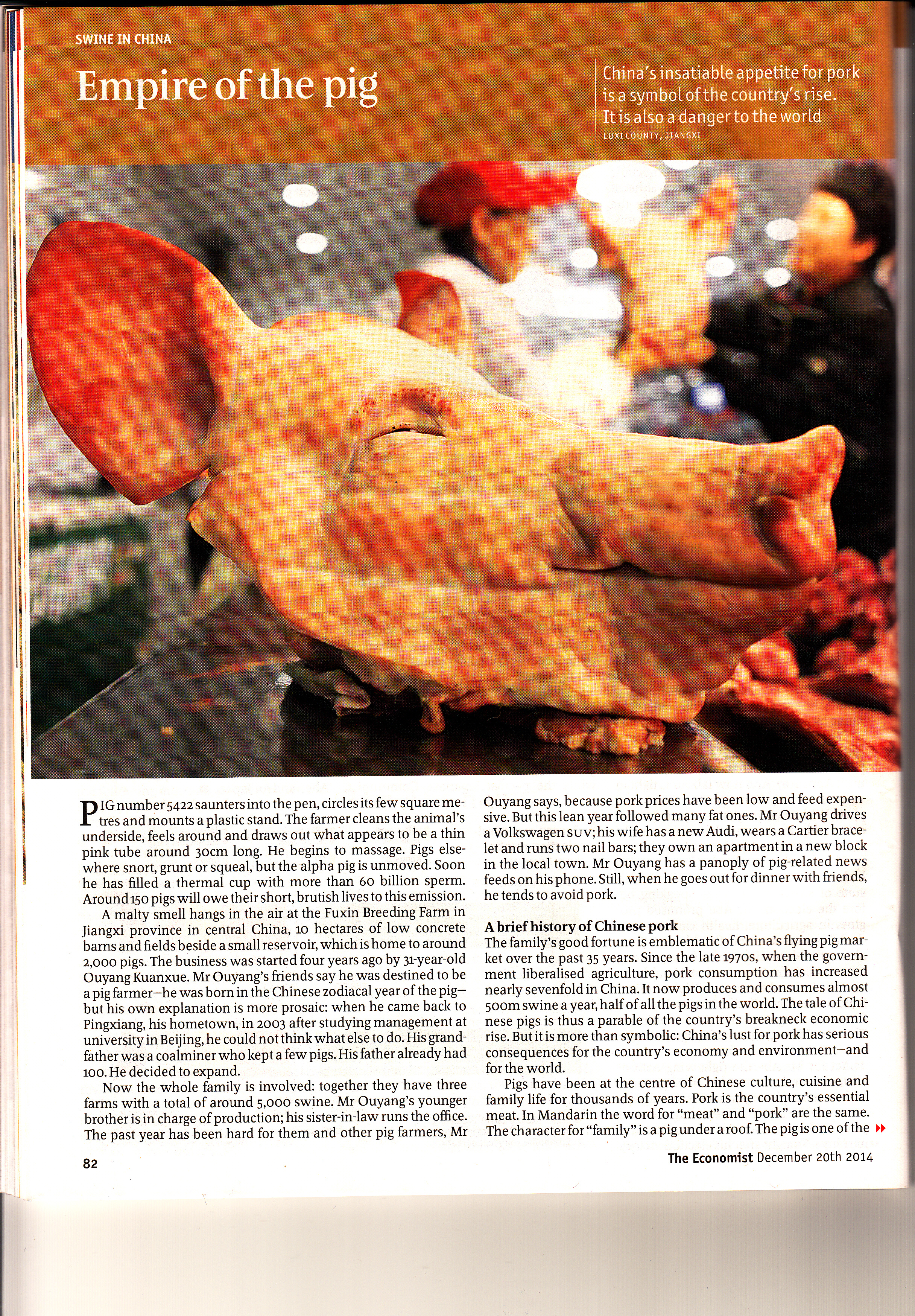 conservative, neo-liberal, it is at least well written and thoughtful. Hence I’m prompted to relay one of those features to readers (20 December 2014, pp82-84). It tells the story of the rise of pork as a symbol of affluence in China. It is a favourite food. Seemingly, Chinese citizens eat the equivalent of half a pig each per year (that is 500 million pigs annually). Such is its importance for the Chinese government seeking social stability, it is subsidised to the tune of $22bn per year. However, this leads to environmental and resource challenges.