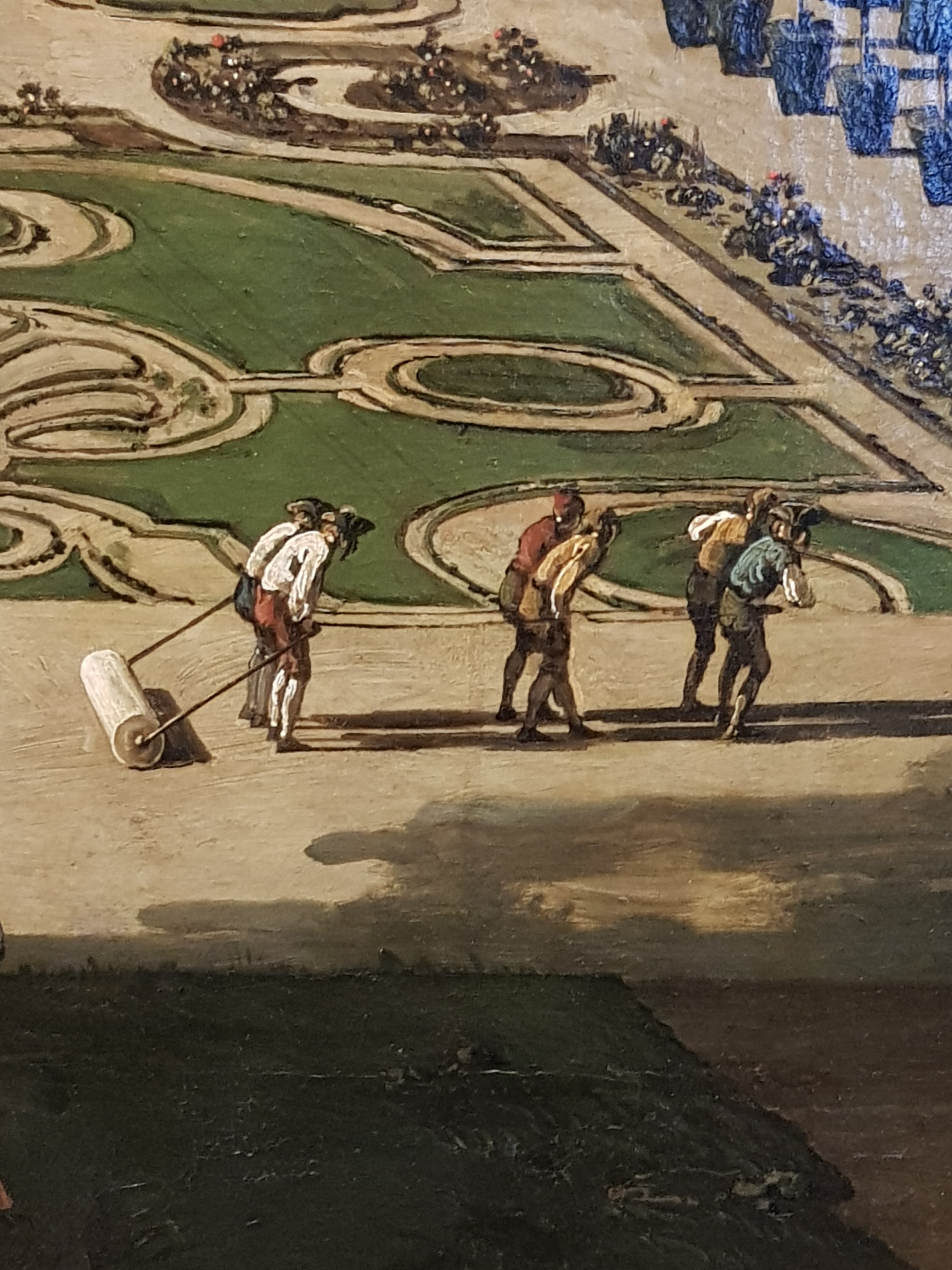 Tintoretto (right). There are lots of court figures in the grounds. But, of course, to keep everything perfect, the groundsmen had to follow them with their rollers. And look closely (left), we can see them!