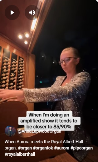 Aurora is a performer, for sure. She is not Dua Lipa with complex dance routines. She is not really stadium music – the RAH is a big venue and takes immense talent and presence to keep its attention. Tickets sold fast and we were relegated to the Rausing Circle, rather in the heavens. The RAH has something that other venues on this tour do not. That thing is the amazing organ. Aurora somehow got Anna Lapwood (right) to rearranged three songs to incorporate that instrument. For me, at least, that addition was beguiling (I love the organ sound in any case). The three songs – Echo of my Shadow, The River and The Seed – elevated this concert beyond what was already memorable. Anna Lapwood is an Associate Artist at the RAH – but so much more than that). Her joy was captured as she let the organ rip during The Seed.