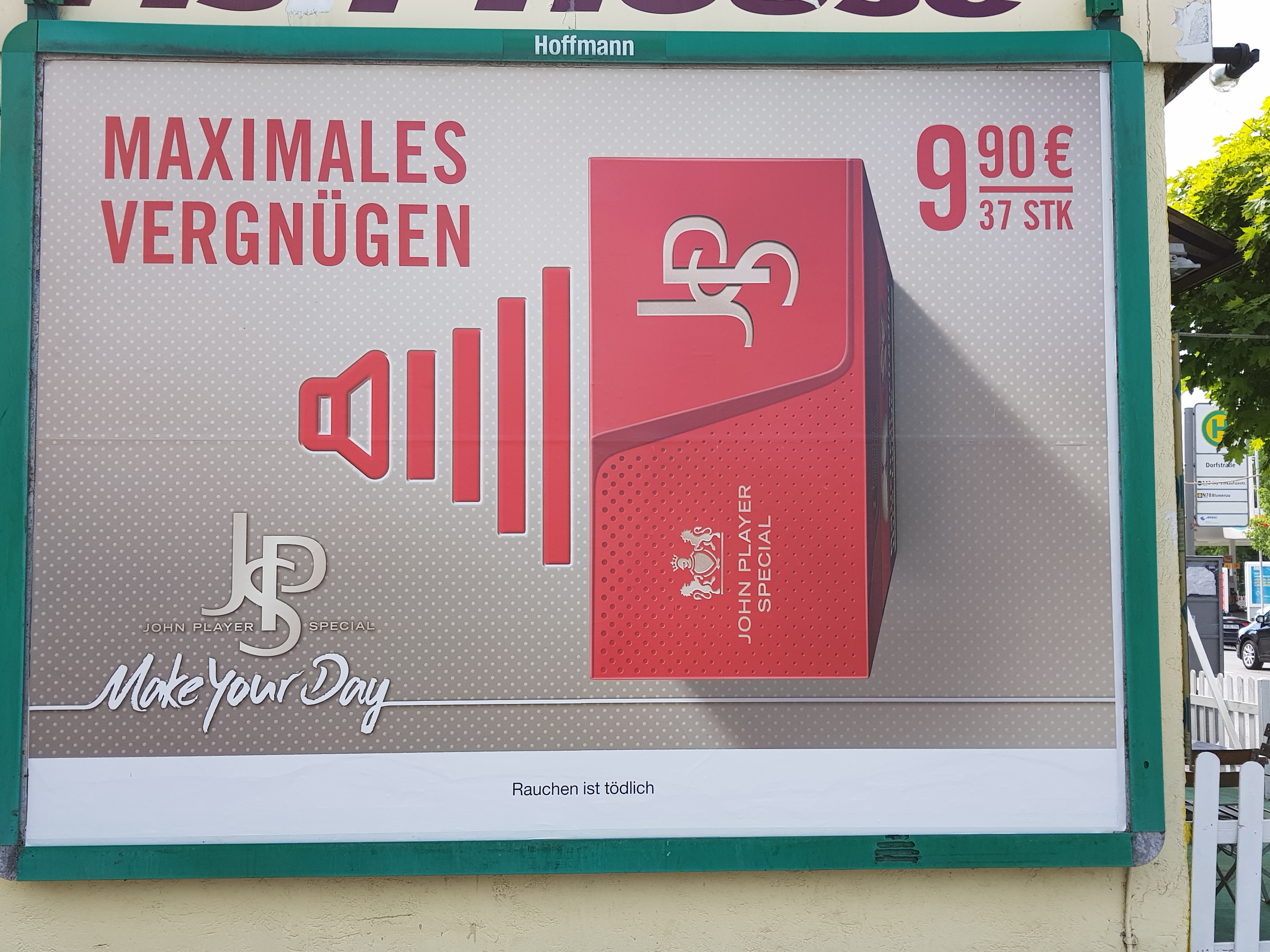 John Player Special is trying to knock us over with its striking new campaign, Make your Day. There’s a lot of red. It is supposed to “fit in”, as the strapline indicates. Because it is compact! What is a compact cigarette? More tobacco? If so, the bit they do have to put on the poster “Rauchen ist tödlich” is as fitting as ever. Deadly.